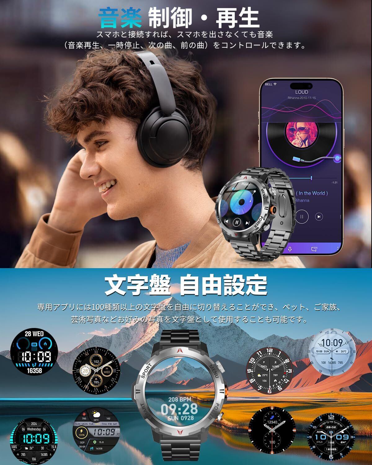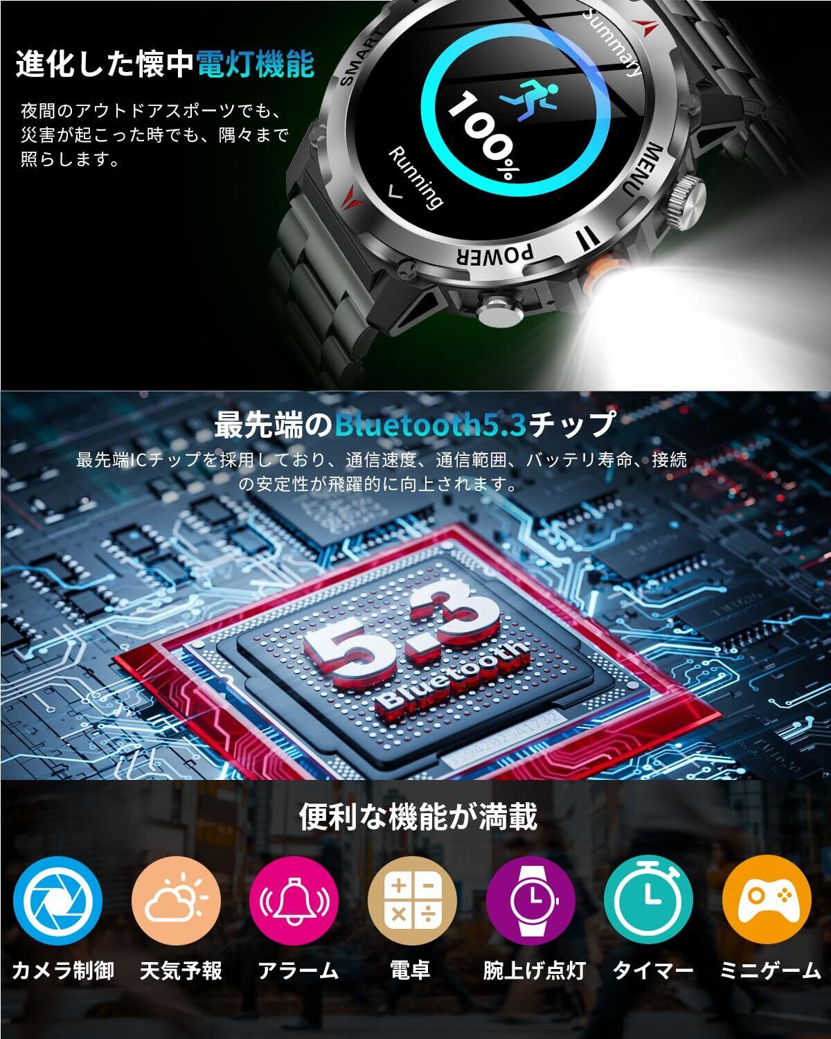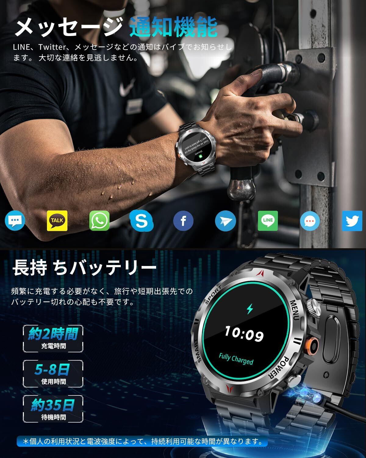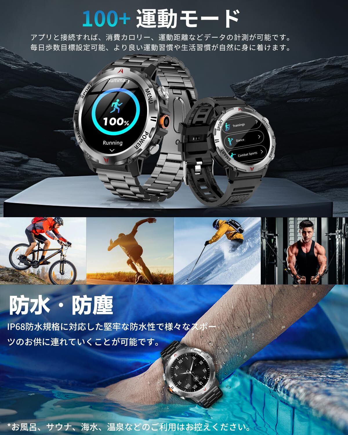 【IP68防塵防水&軍用規格スマートウォッチ】このスマートウォッチは業界最高水準のIP68防塵防水機能を実現、水や汗による故障の心配なく利用できます。本スポーツウォッチは屋外や、粉塵の舞う製造工場で使用することができ、防塵防滴、耐衝撃、耐高温/耐低温性能などの頑丈設計を行い、多くの軍用標準テストに合格することができます。また、高精細で美しい色を表現できる1.46インチタッチディスプレイを搭載し、視認性に優れた高解像度大画面を採用され、画質がより鮮明になり、より高精度な大画面で文字を表示されます。例のない快適な視覚感と優れた操作感をもたらします。※お風呂、サウナ、海水、温泉などのご利用はお控えください。