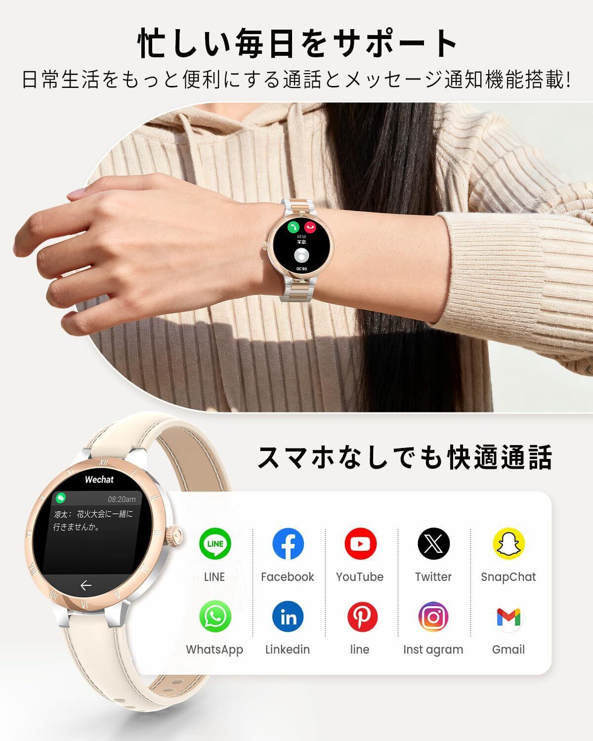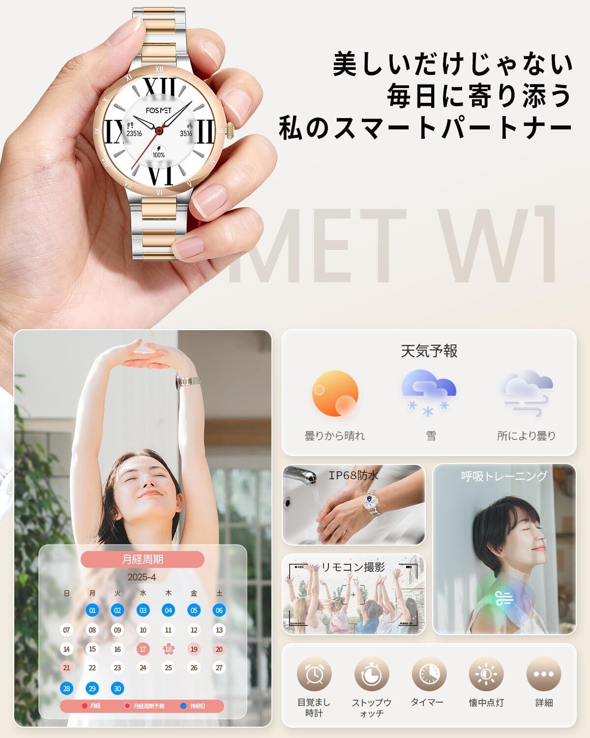 「この『FOSMET W1 スマートウォッチ』は、丸型デザインとオフホワイトのレザーと金属製のバンドで、女性にぴったりのスタイリッシュなアイテムです。常時表示のAMOLEDディスプレイとサファイアガラス搭載により、鮮明で美しい視界を実現しています。睡眠管理や運動の自動検知機能を持ち、あなたの健康をサポートします!」