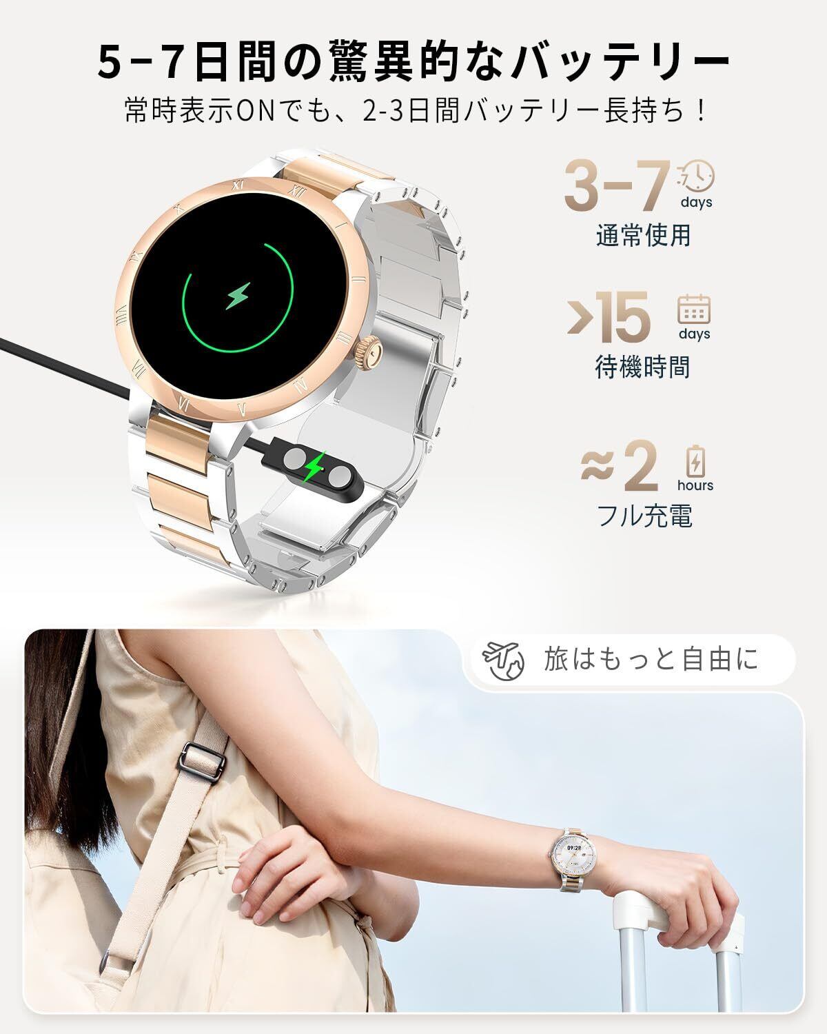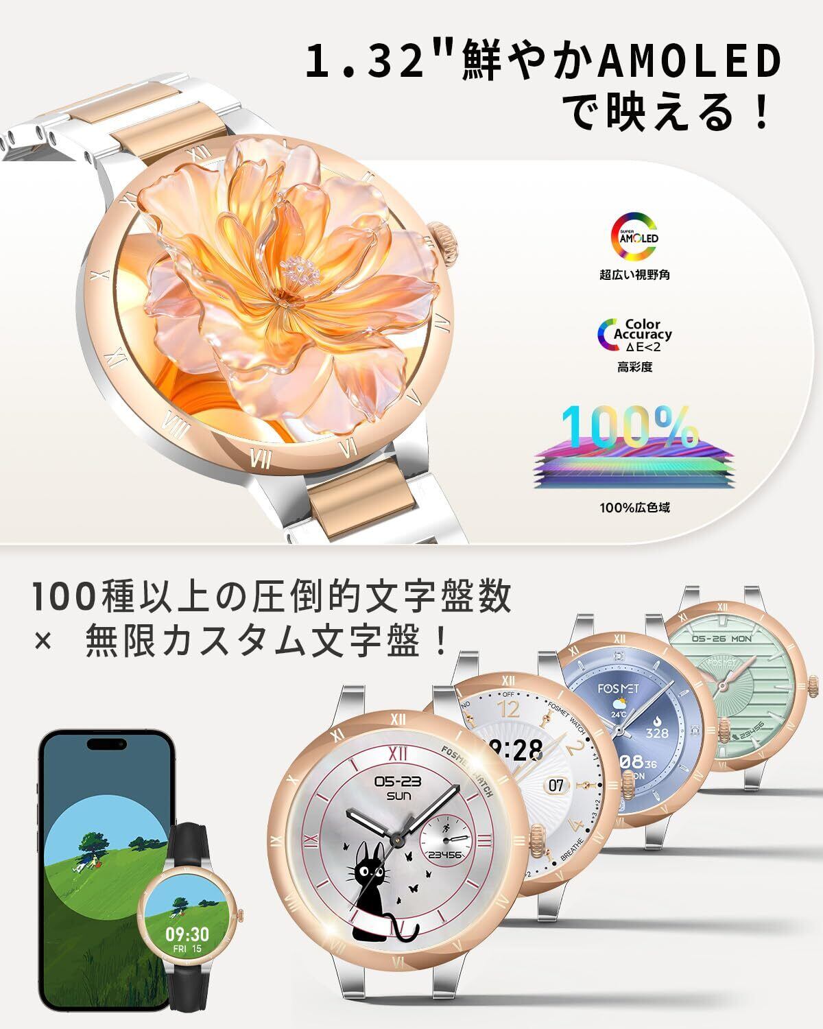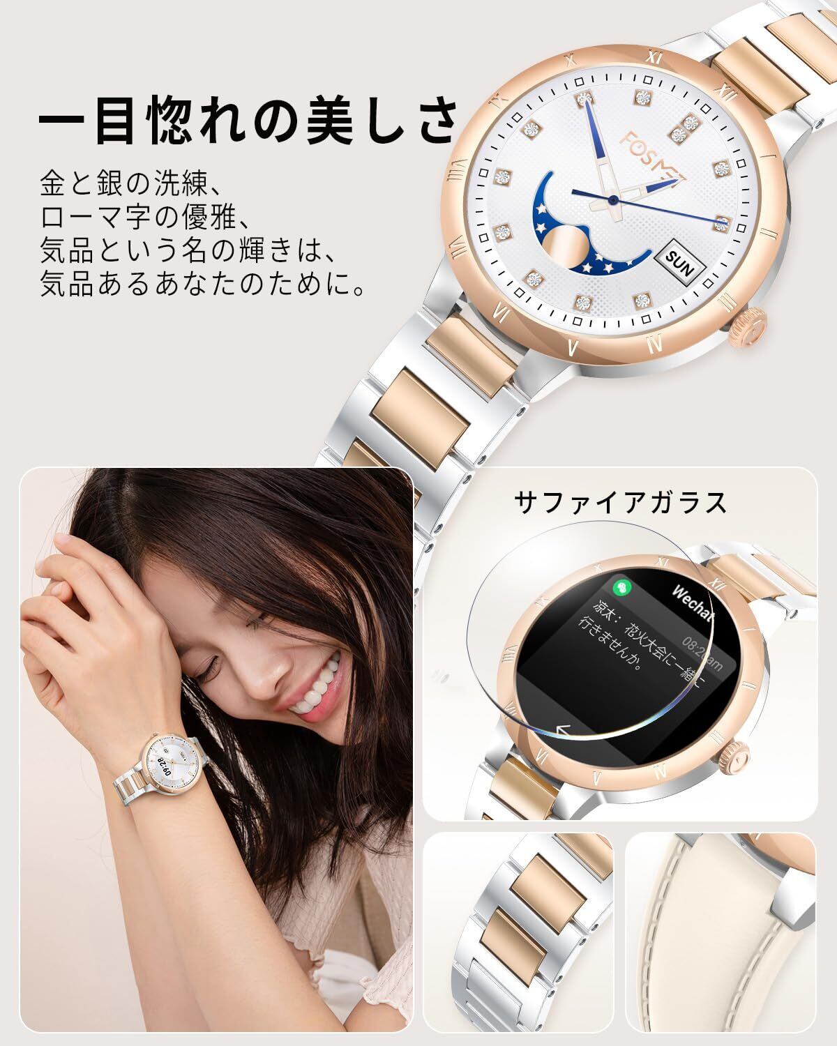 【サファイアガラス・AMOLED搭載&光沢カラーが特徴】FOSMET W1 スマートウォッチ レディースは、ゴールドとシルバーの高級感溢れるカラーに、ローマ数字が刻まれたベゼルが上品さを引き立て、女性の手首にフィットする1.32インチのサファイアディスプレイを採用により、よりエレガントでシンプルな小さめのスマートウォッチを実現しています。鮮やかなAMOLED画面は視認性に優れ、サファイアガラスは非常に滑らかで、心地よくスライド操作が可能。ベルトは2種類から簡単に交換できるので、初めてのレディース腕時計や日常使いにも最適です。シンプルで飽きのこない丸型デザインは、オフィスからカジュアルまで幅広いシーンで活躍します。