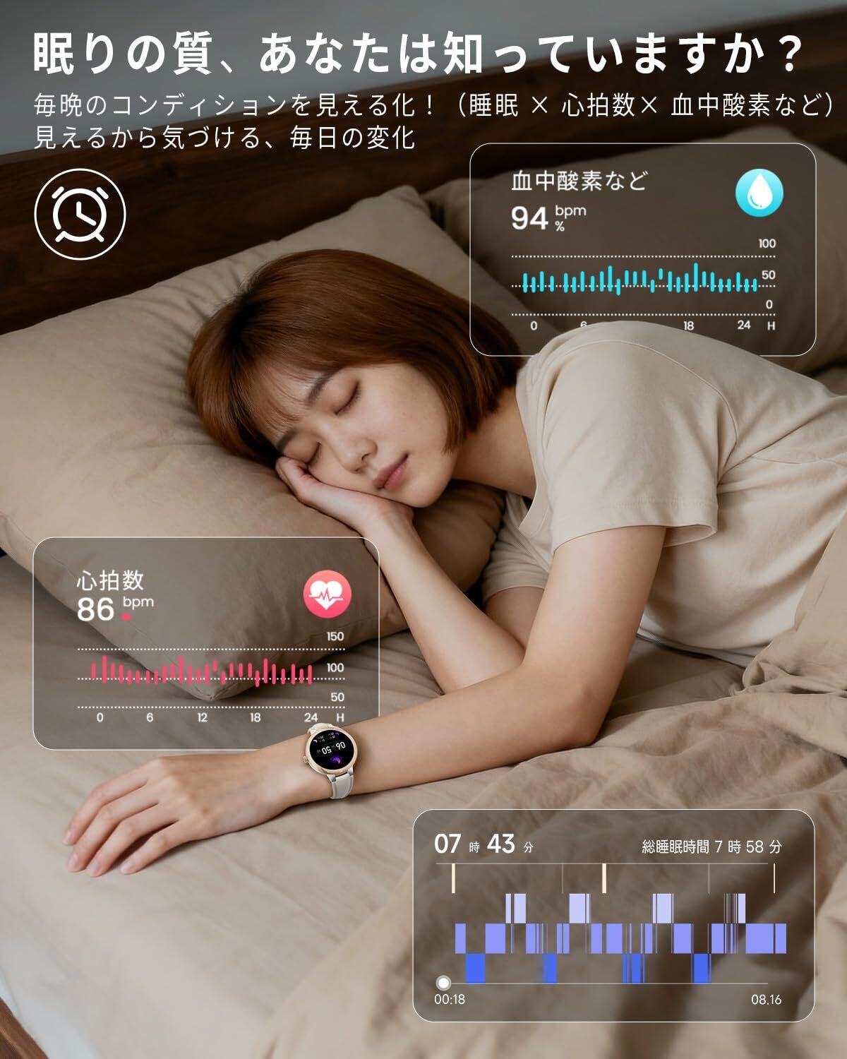 【睡眠を管理して、より良い毎日へ】月経周期の管理(※周期の設定はアプリ側で行います)はもちろん、質の高い睡眠を目指したい方には、人気のFOSMET W1 スマートウォッチ レディースがおすすめです。このスマートウォッチでは、睡眠の質を数値として「見える化」できるため、自分の睡眠パターン(深い睡眠・浅い睡眠・レム睡眠)を客観的に把握することが可能です。毎日の睡眠データを蓄積することで、変化を実感しやすく、改善へのモチベーションも保ちやすくなります。さらに、心拍数や血中酸素レベルの記録機能も搭載されており、より詳細な睡眠分析ができる点も大きな魅力。まずは日々の睡眠をモニタリングする習慣をつけることで、自然と「睡眠の質を意識する」生活へとつながります。