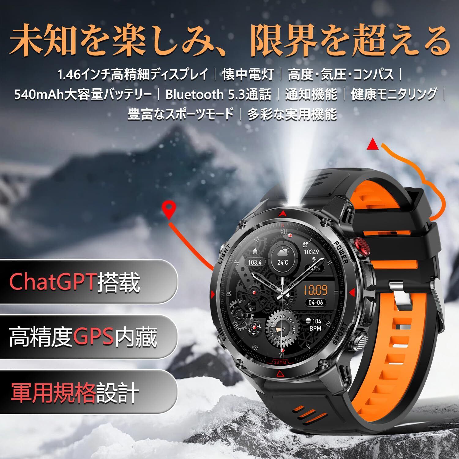 スマートウォッチ ChatGPT搭载 GPS運動軌跡記録 軍用規格 懐中電灯 iPhone対応 アンドロイド対応 1.46インチ高精細ディスプレイ 長持ちバッテリー スポーツウォッチ 100+運動モード 睡眠管理 歩数計 IP68防水 smart watch 着信通知・lineアプリ通知 Bluetooth通話 音声アシスタント 腕時計 実用機能 音楽再生 多種類文字盤 高度気圧計 日本語説明書