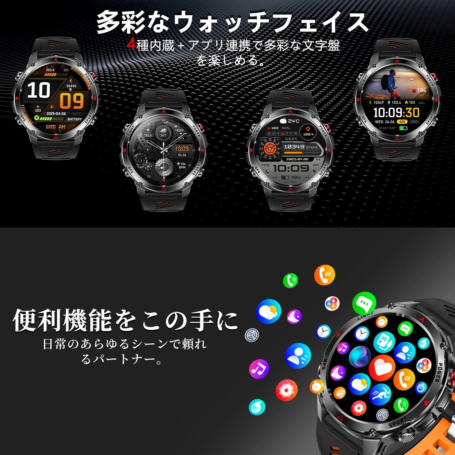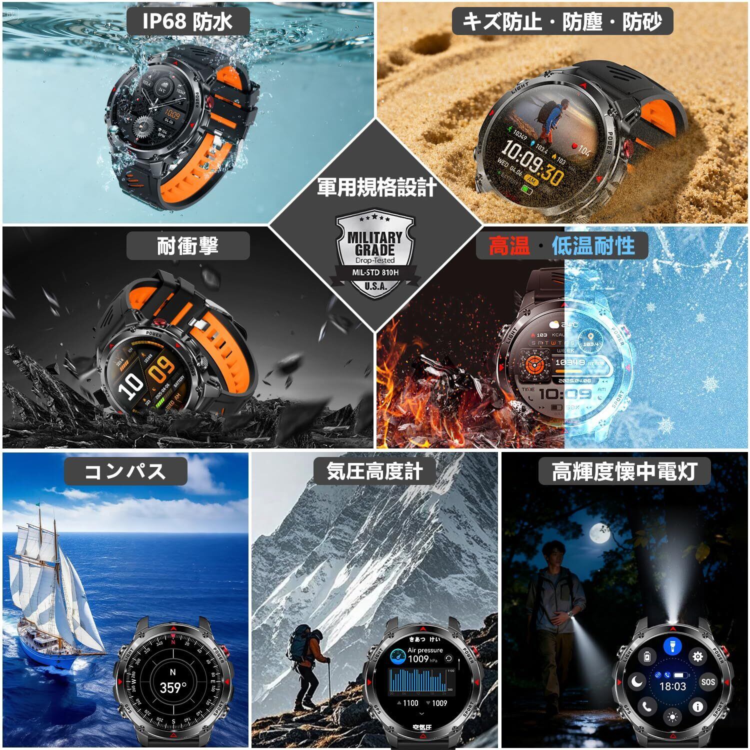 【軍用規格設計&IP68防水防塵性能&長時間バッテリー&1.46インチ大画面】軍用規格に準拠した堅牢な設計で、衝撃・高温・低温・防塵といった厳しい条件に耐えられるタフネスモデルです。登山やキャンプなどのアウトドア活動はもちろん、砂埃の舞う工事現場や気温差の激しい環境下でも安定して動作し、頼れるパートナーとなります。耐摩耗性に優れた素材と傷に強いガラスを採用し、日常生活の小さな衝撃から過酷な環境まで安心して使用できます。さらに、IP68等級の防水防塵性能を備え、雨の日のランニングや手洗い時、アウトドアでの突然のスコールにも対応。汗や水しぶきを気にせず、スポーツや旅行中も着けたまま快適に使えます。水泳などの日常的なシーンでも取り外す必要がなく、アクティブなライフスタイルに最適です。また、大容量バッテリーを搭載し、日常的な使用で約7〜10日間持続可能。待機モードではさらに長時間使用でき、長期の出張や旅行、電源の確保が難しいアウトドア活動でも充電の心配を減らします。軍用規格の堅牢性とIP68の高い防護性能、そして長時間バッテリーの組み合わせにより、日常から冒険まで、あらゆる場面で安心して使用できるスマートウォッチです。1.46インチのIPSフルタッチスクリーンは360×360の高解像度を誇り、鮮やかな色彩とクリアな表示を実現。運動中でも視認性が高く、メール・LINE通知・通話情報を一目で確認できます。さらに抬腕点灯機能により、手首を上げるだけで画面が瞬時に点灯し、時間やメッセージを即座に把握。屋外ランニングやジムトレーニング中でも操作の煩わしさを軽減します。