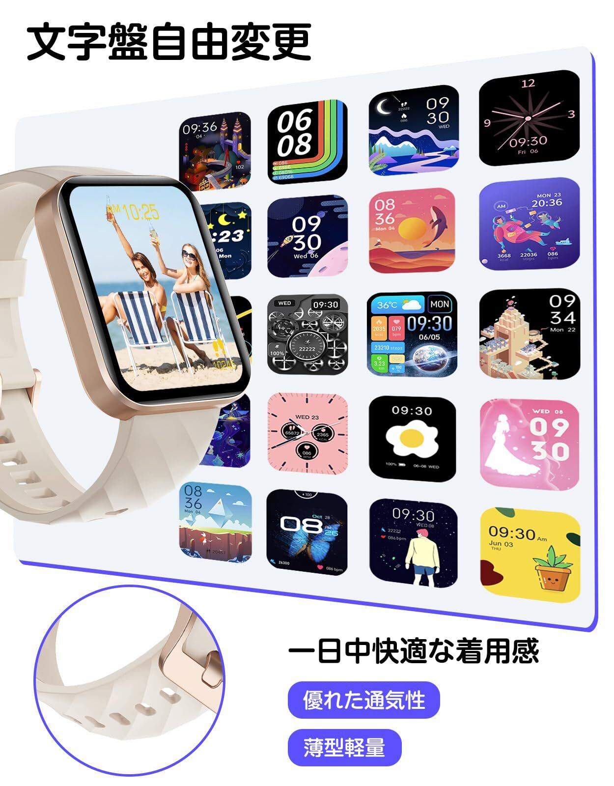 【文字盤自由変更&お洒落なデザイン】専用アプリに用意された200種類以上の文字盤に加え、家族の写真、ペット、好きな柄、キャラクターなど、お気に入る要素の写真を文字盤に設定可能です。ピンクや星空ゴールドなどの淡いカラーから、ブラックやパープルなどのダークカラーまで、豊富なカラーバリエーションを取り揃えています。雰囲気のあるシンプルなデザインは男女を問わず、ファッション、ビジネス、日常など様々なシーンで装着しても違和感がりません。本体は軽量で、ベルトは通気性がよく柔らかいので、長時間着用しても負担にならなりません。また、1.85インチの大型HDスクリーンを採用し、健康データやアイコンを自然でクリアな表示と鮮明な文字を実現しています。