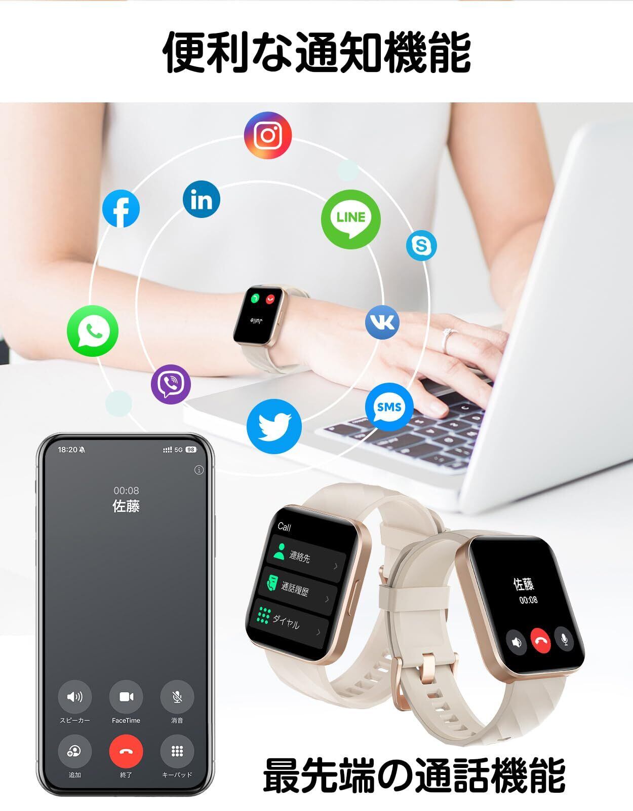 「LINEやその他のメッセージ通知が手元で確認できるので、重要な連絡を見逃す心配がありません。通話機能も備えており、忙しい時でもスムーズに連絡が取れます。手元で情報管理が簡単に行え、生活や仕事の効率を高めます。」
