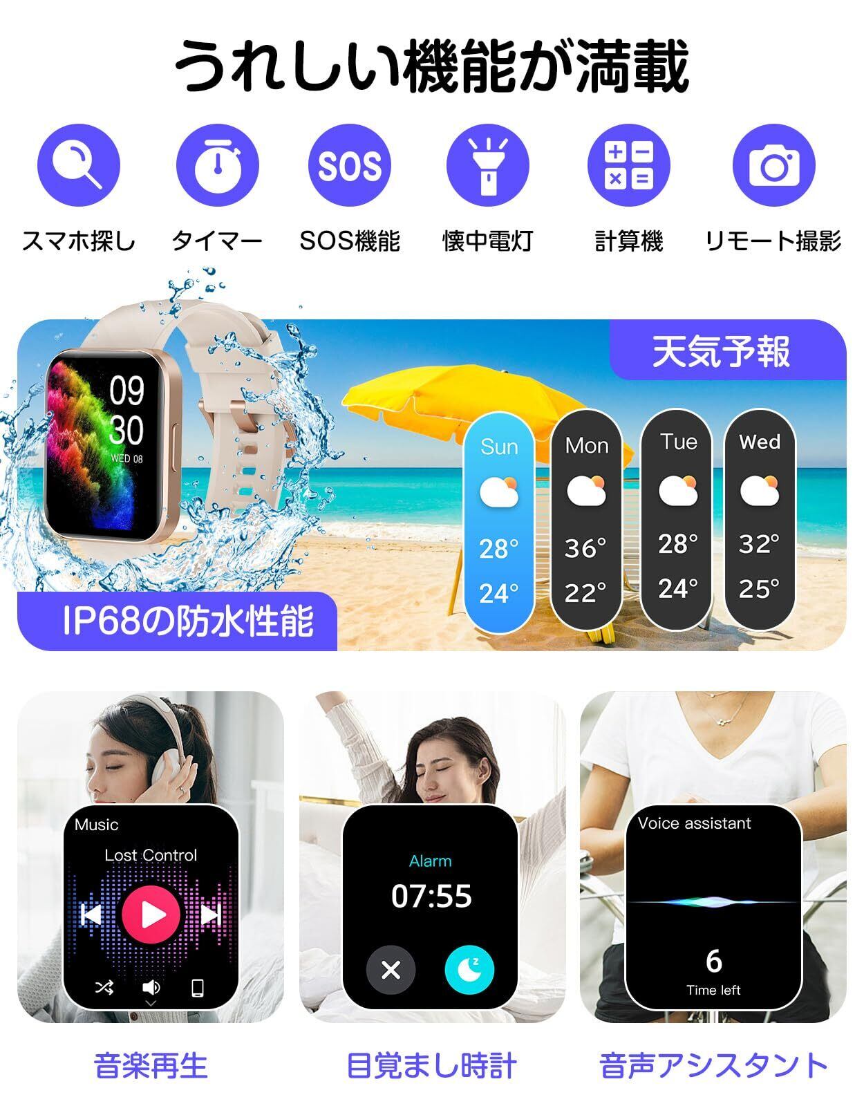 「IP68等級の防水防塵性能を備えており、汗や雨を気にせずに使えます。スポーツシーンや日常生活での不安を解消し、安心してお使いいただけるスマートウォッチとなっています。」