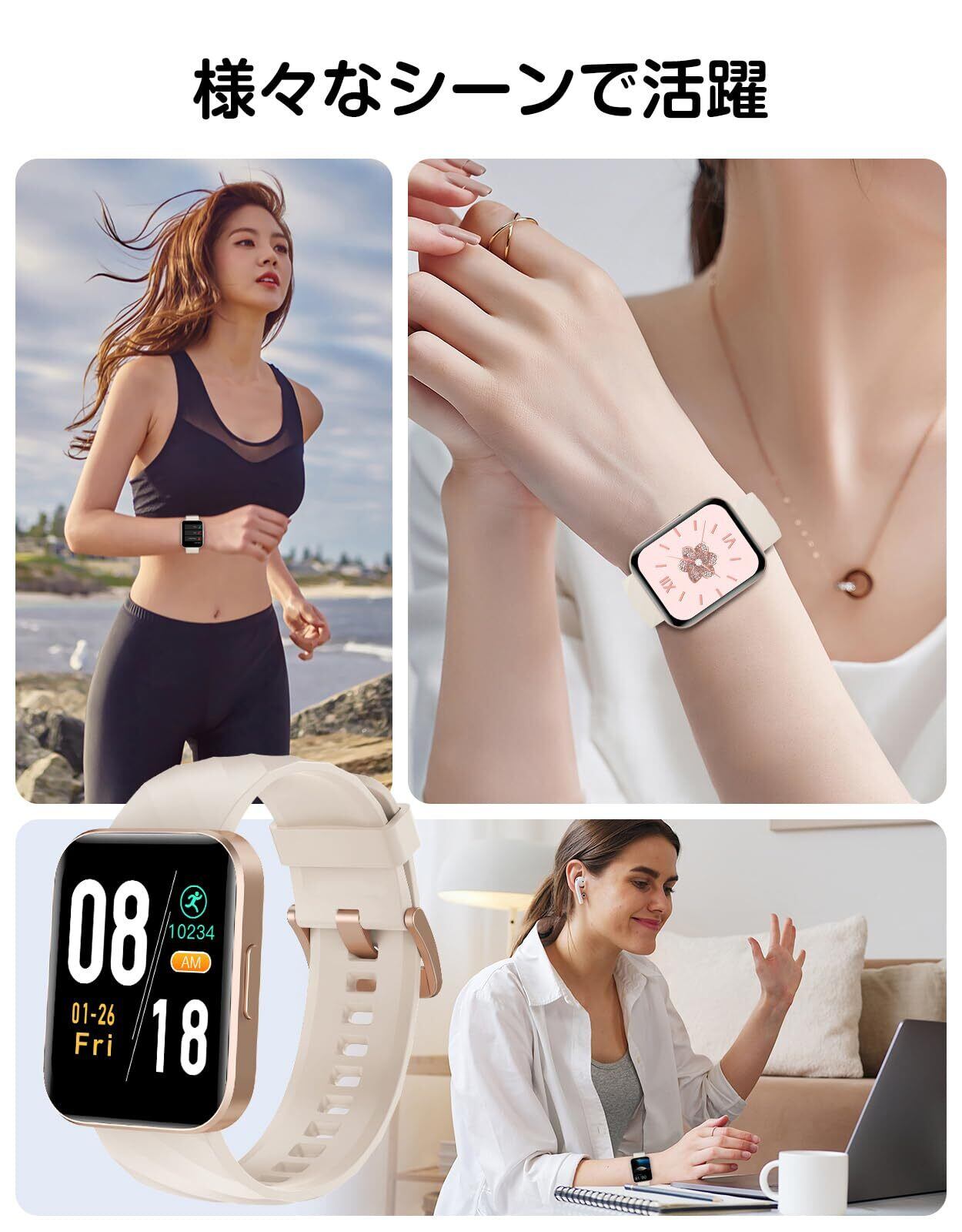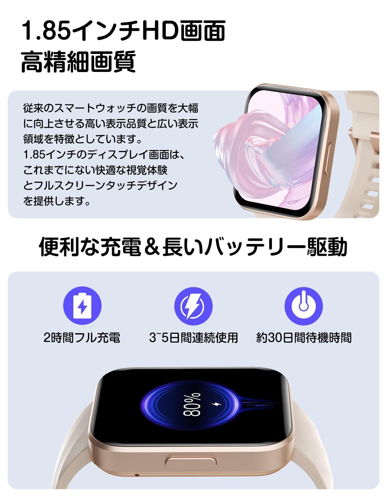 「この『スマートウォッチ』は、iPhone及びAndroidに完全対応し、Bluetooth通話やLINE通知を実現。1.85インチの大画面を備え、100以上の運動モードをサポートしているため、あなたの健康管理やフィットネスライフを大いに助けてくれます。持ち運びやすさと機能性を両立したデザインです!」