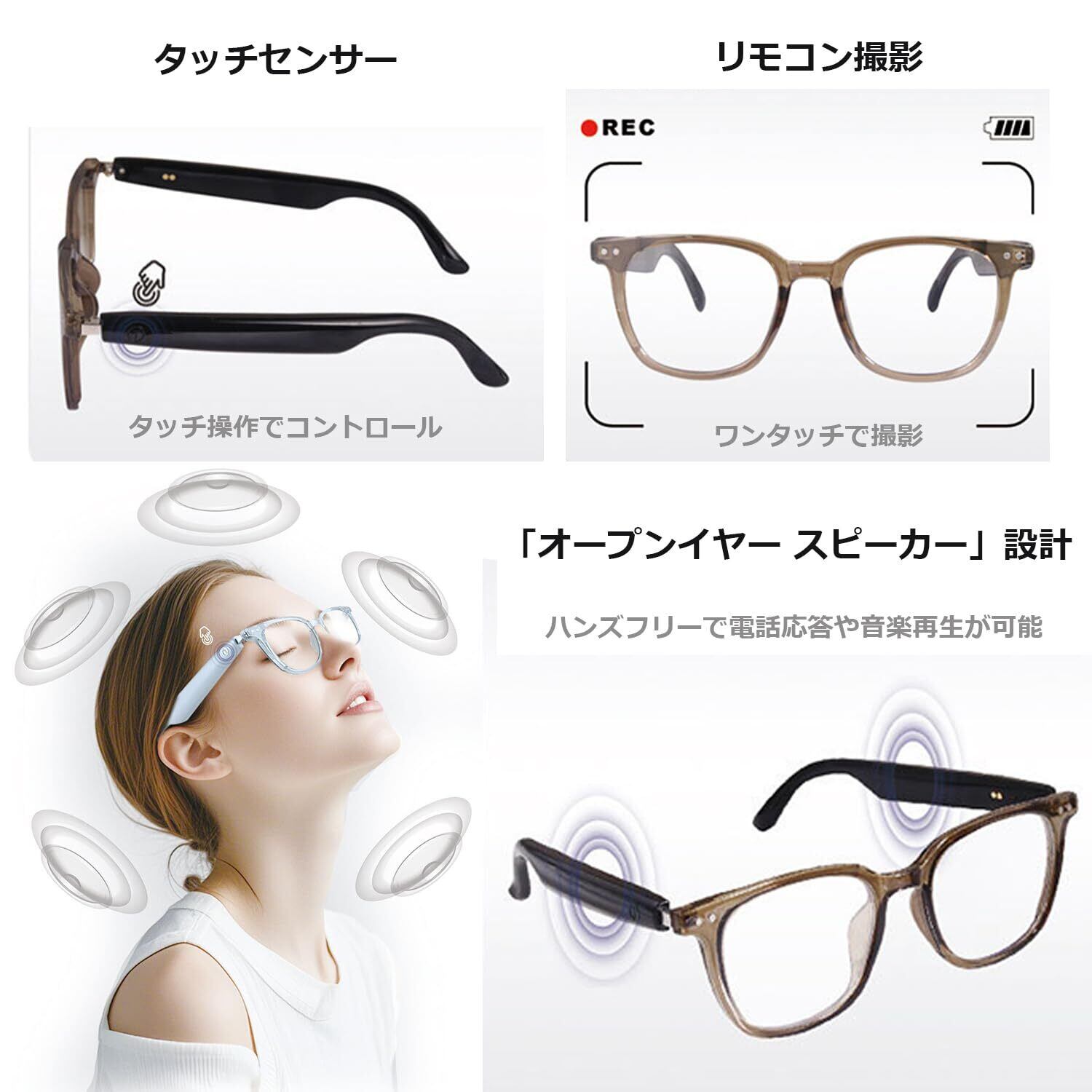 「Bluetooth機能を搭載したスマートメガネは、内蔵の高品質スピーカーにより、音楽を耳元で楽しむことができます。タッチコントロールを活用することで、曲の再生や一時停止、通話を簡単に管理。頭を使わずに音楽を楽しみながら、アクティブに過ごせます。」