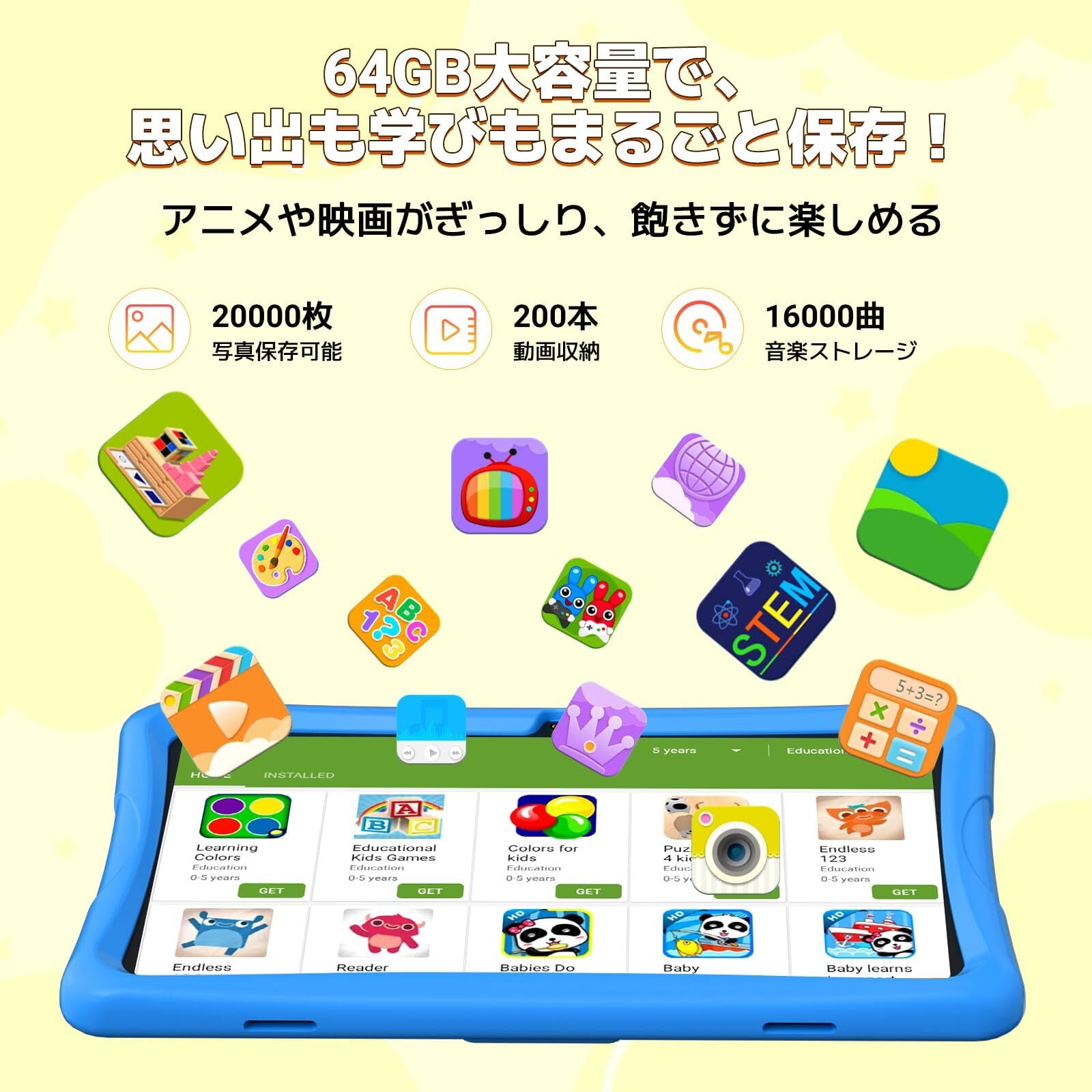 「Android 15を搭載したこのタブレットは、12GBのRAMと64GBのストレージを備えています。多彩なアプリを快適に利用できるだけでなく、最大2TBのTFカードを利用すれば、さらに容量を追加できます。お子様の好奇心をしっかりサポートします!」