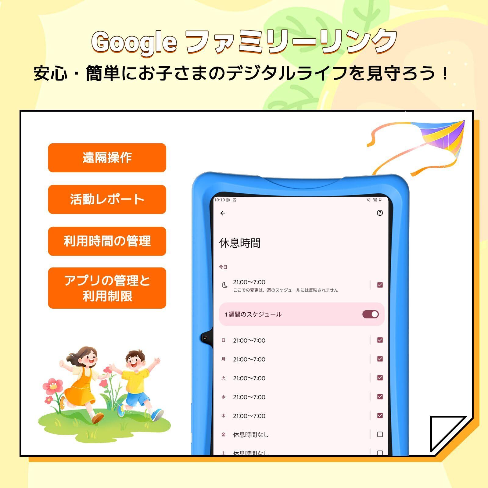 【保護者による安心管理】Google Family Link の保護者向け管理機能を使えば、スマートフォン、パソコン、タブレットからお子さまの使用状況や画面時間を遠隔で簡単に確認できます。お子さまの興味や成長の過程を把握し、新たな関心分野を発見する手助けにもなります。年齢フィルター機能により、お子さまの年齢に適したコンテンツが自動で表示され、成長段階に応じて柔軟に設定を変更することも可能です。使用時間は15分単位で細かく設定できるため、使いすぎを防ぎ、お子さまは安心して利用でき、保護者も安心です。