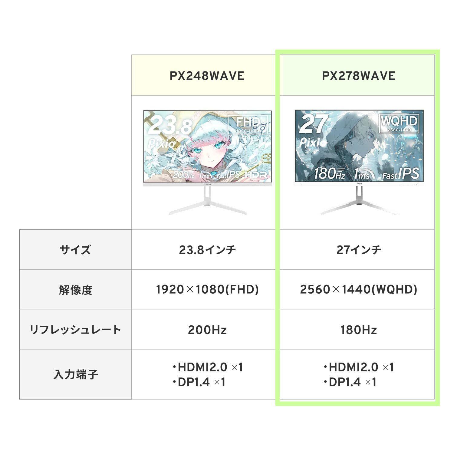 【型番】 PX278WAVEW 【商品説明】 PX278 WAVEは、27インチWQHD Fast IPSパネルを搭載した高画質なゲーミングモニターです。1ms(GTG)の高応答速度と180Hzという高リフレッシュレートにより、ゲームプレイも快適に。