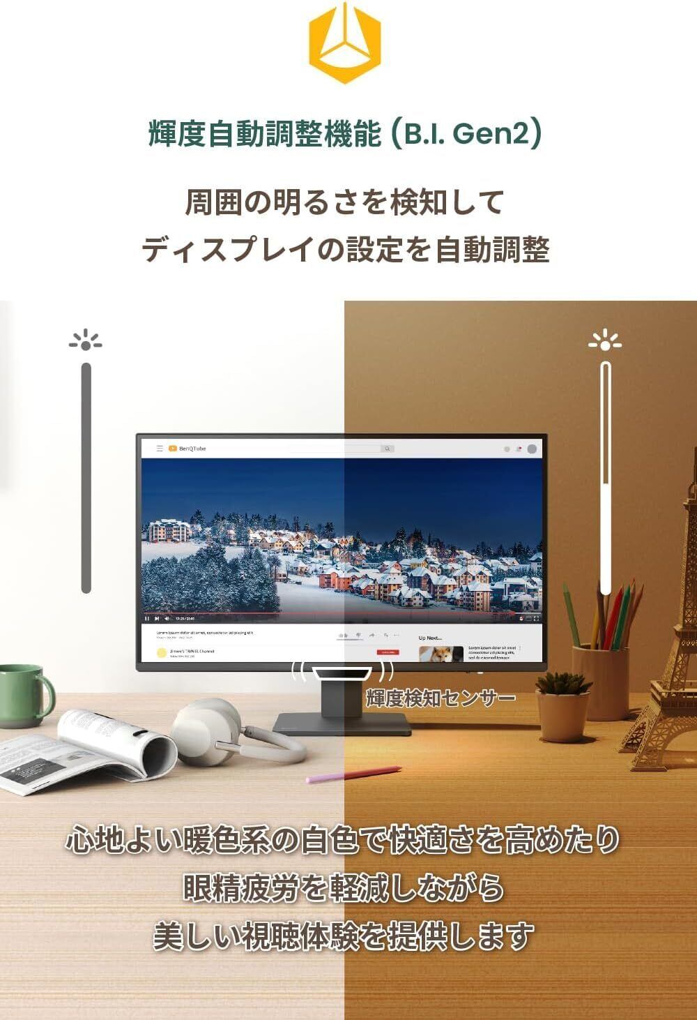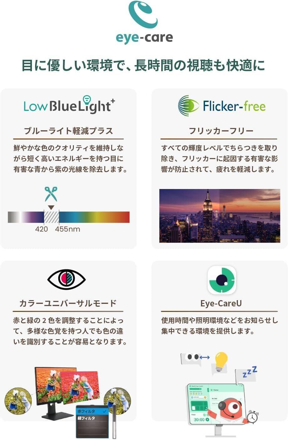 「輝度自動調整機能(B.I. Gen2)を搭載し、周囲の明るさに応じて最適な輝度を提供します。また、ブルーライト軽減プラス機能とフリッカーフリー設計により、長時間の作業でも目の疲れを軽減し、快適な使用が可能です。」