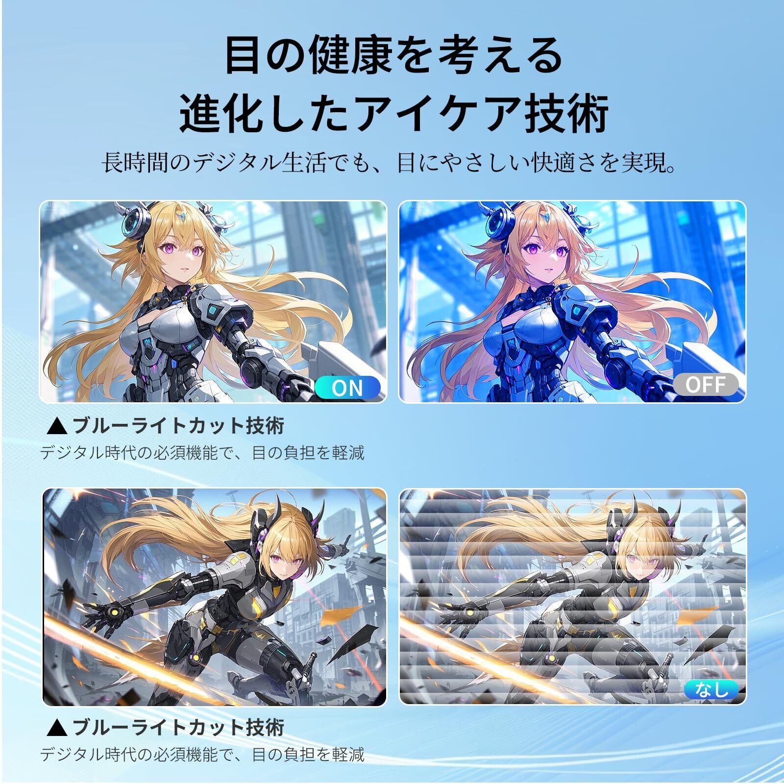 「フリッカーフリー設計により、長時間使用しても目が疲れにくく、快適な視聴をサポートします。Softeware LBL技術により、ブルーライトをカットし、目に優しい環境を提供しますので、在宅勤務やデザイン作業に最適です。」