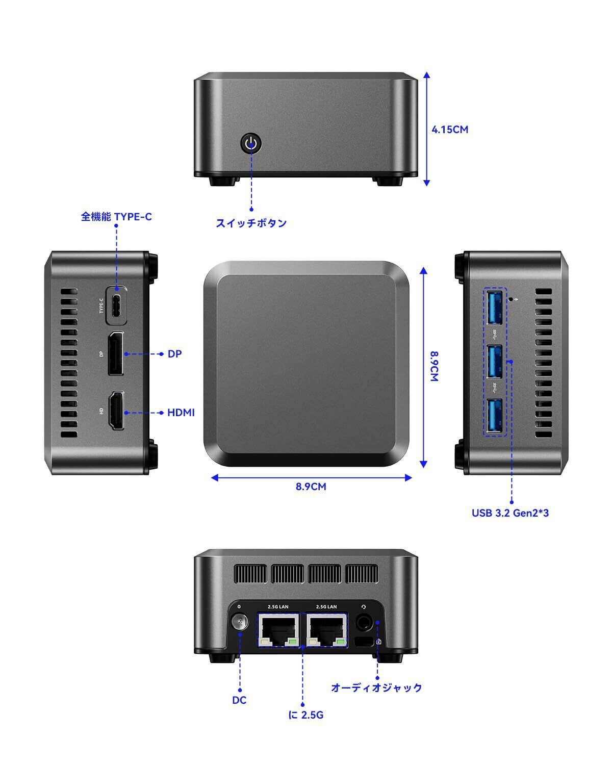 【超小型多機能PC】サイズはわずか8.9*8.9*4.15CM、重量はわずか0.2KGであるが、HDMI、DPと4K 60Hzのトリプルディスプレイ出力に対応できるフル機能のTpye-Cインターフェイスを搭載し、2.5G LANインターフェイスを2つ備えているため、DIYの可能性を高めることができる。