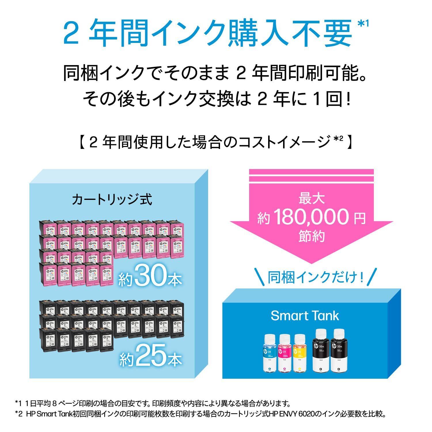 【特徴2】同梱インクがなくなっても1本あたりのお値段がお求めやすく、A4カラー文書の1枚当たりの印刷コストが、カートリッジ式HP ENVY 6020と比較して約96%も削減できます。黒色のインクには顔料インクを採用していて、水に濡れてもにじみにくいので、文書もくっきりキレイ。 プリント解像度 モノクロ:最高 1200×1200dpi、カラー:最高 4800×1200dpi