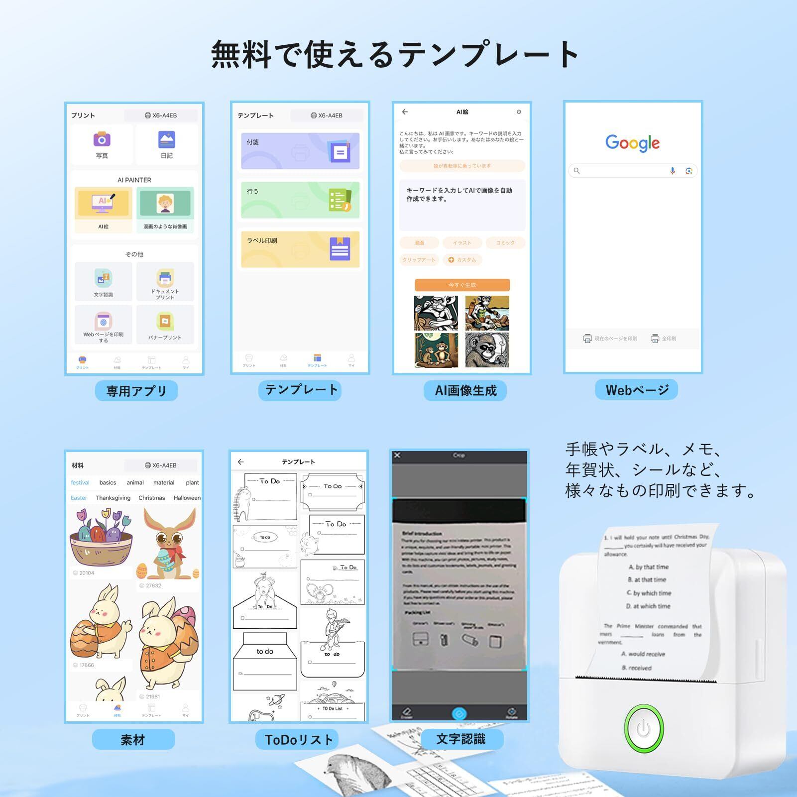 スマホプリンター ミニプリンター スマホ対応 【AIアニメ化&画像生成AI】 サーマルプリンター Bluetooth接続 USB充電式 1200mAh モバイル Android iOS対応 ポータブル 小型 モノクロ ラベル 勉強/ノート/写真/リスト/メモ/手帳/領収書/ラベル/テレワーク/業務用/家庭用 感熱紙 2ロール カッター付き