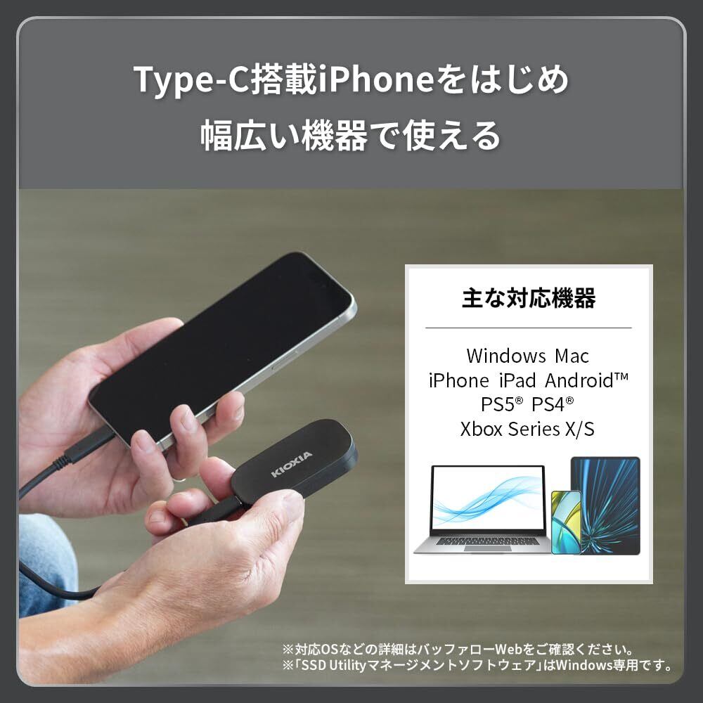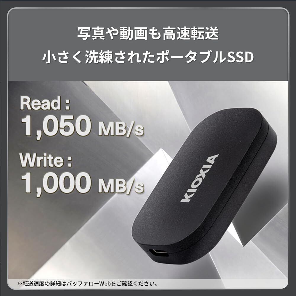 「『キオクシア KIOXIA SSD 外付け 500GB』は、最大読出速度1,050MB/秒を誇る超高速ポータブルSSDです!USB3.2 Gen2に対応し、Type-C搭載のiPhoneやPS5、PS4でも動作確認済みなので、様々なデバイスでの使用が可能です。」