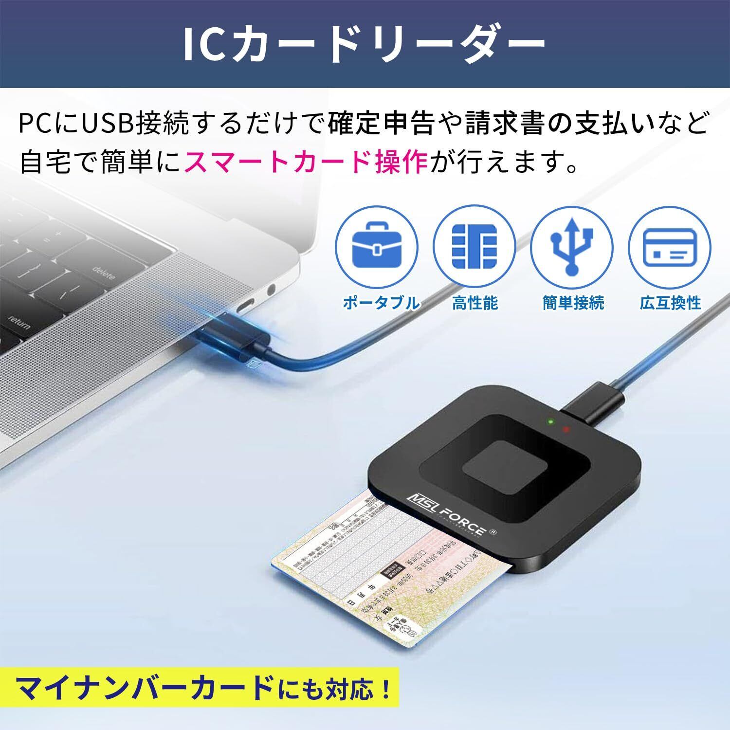「『MSL FORCE ICカードリーダライタ』は、マイナンバー対応のUSB接続型ICカードリーダライタです。WindowsやMac OSに幅広く対応しており、設置不要で簡単にお使いいただけます。日本語の説明書が付属しているため、初めての方でも安心してご利用いただけます。」