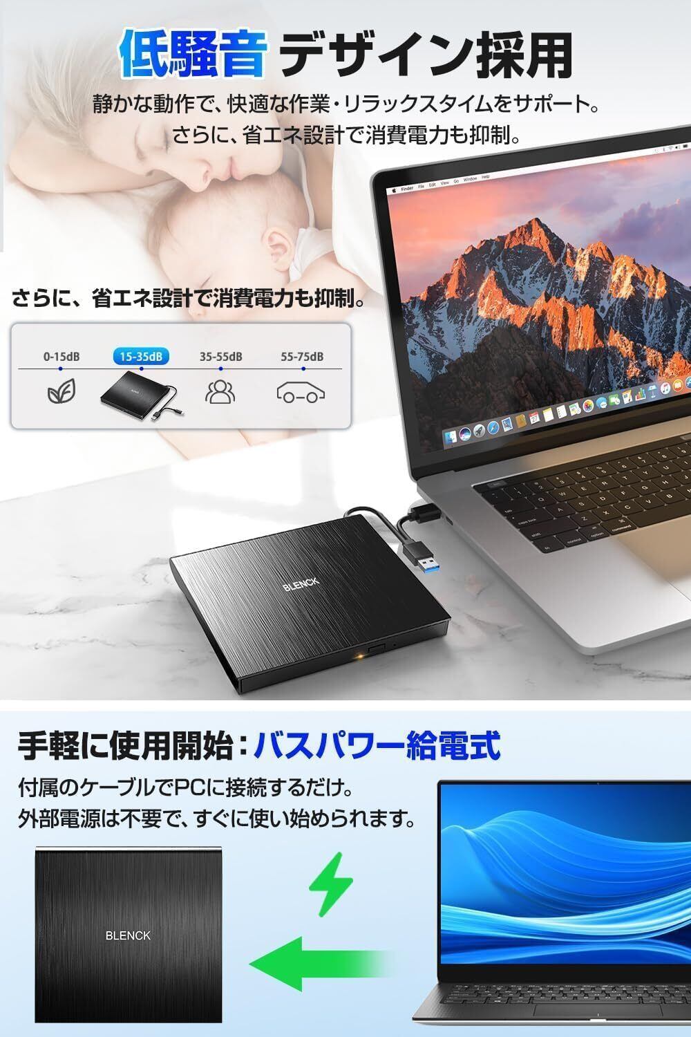 【業界最高性能チップ搭載・高速処理・極静音設計】 2025年最新高性能チップを採用した 外付けdvdドライブ です。この cdドライブ 外付け で、DVD最大8倍速、CD最大24倍速の高速読み書きに対応し、データ転送の安定性とスピードを兼ね備えている 外付けdvdドライブ です。大容量のデータや動画、音楽もスムーズに読み書き可能。ビジネス文書のバックアップや映画・音楽再生など、さまざまなシーンで安定したパフォーマンスを発揮できる 外付けcdドライブ です。 dvdドライブ 外付け で、静音設計により、稼働音を最小限に抑え、深夜作業や図書館でも気にならず快適に使用可能。出張や旅行先での使用はもちろん、自宅での 外付け dvd ドライブ としても最適です。
