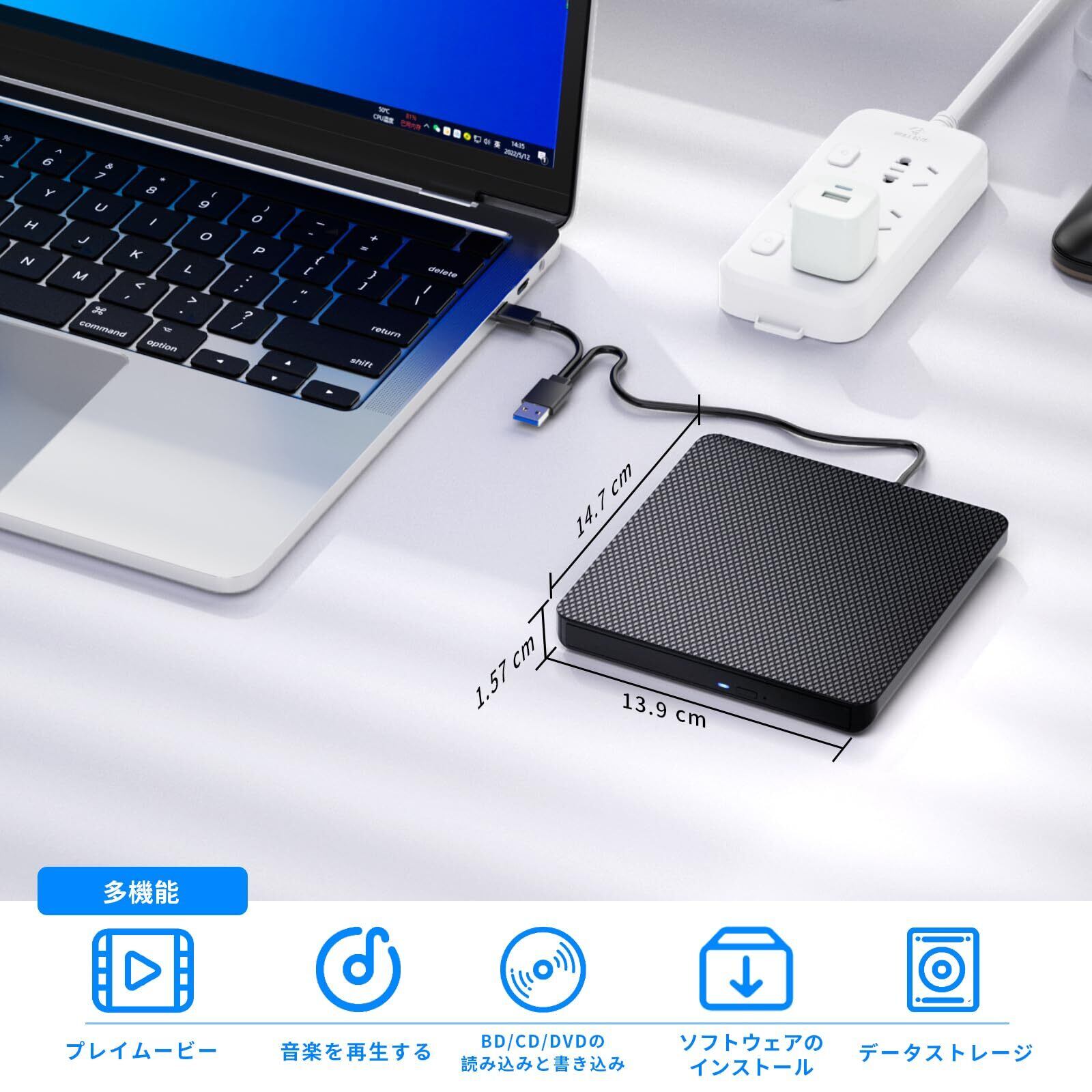 【ご注意】:ブルーレイドライブには書き込み・再生ソフトが付属していないため、別途購入が必要です。また、車、Chrome、テレビ、BDレコーダー、タブレット、Surface/MACタブレット、プロジェクター、スマートフォンでのブルーレイ再生には対応しておりません。十分な電力供給のため、USBハブや延長ケーブルの使用は避けてください。ご注意:十分電力供給を確保するために、USBハブ と USB コネクタをご利用しないでください。