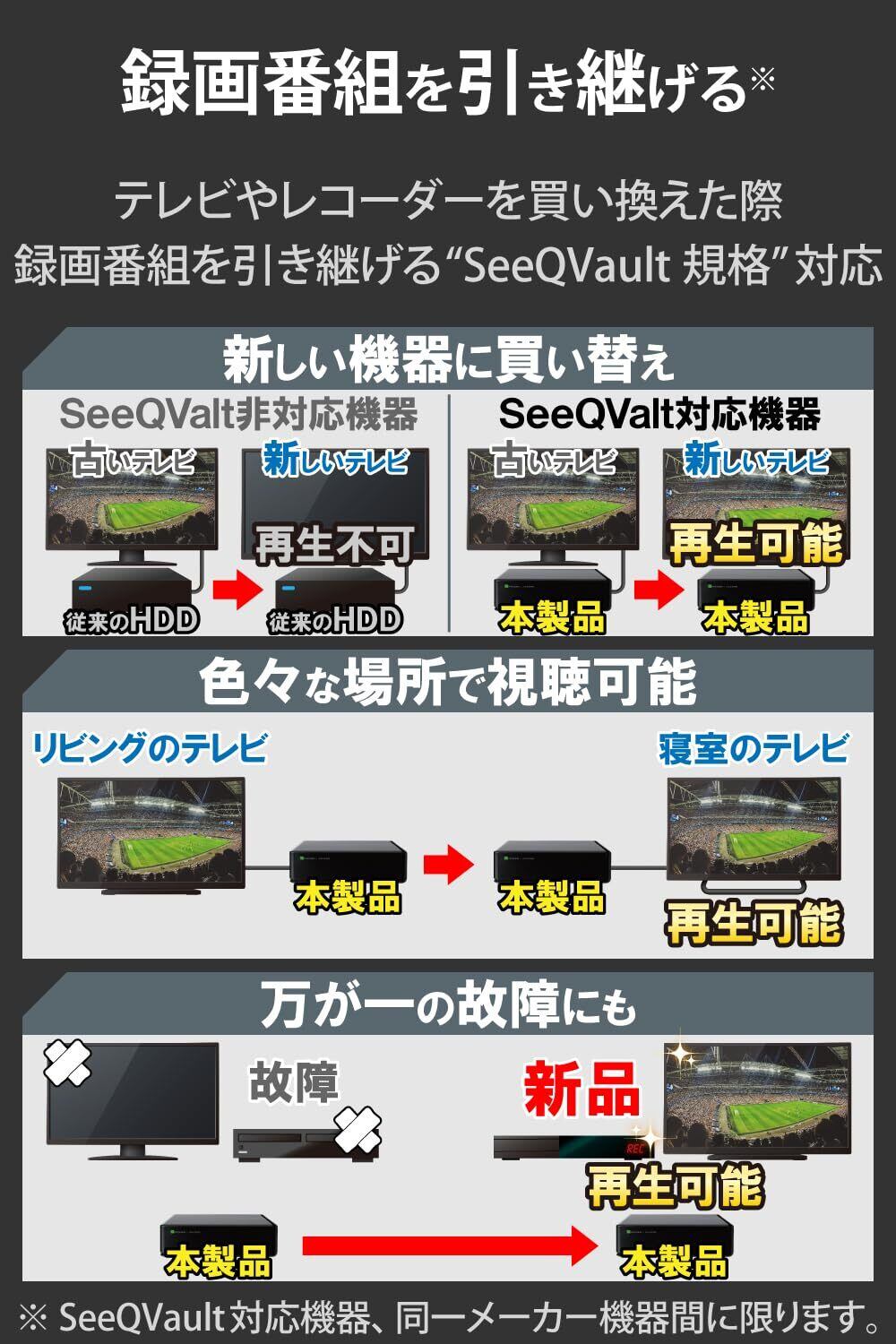 「この外付けハードディスクは、SeeQVaultに対応しており、さらに高画質なテレビ録画を実現します。見逃した番組も安心して保存でき、後からじっくり楽しむことができます。」