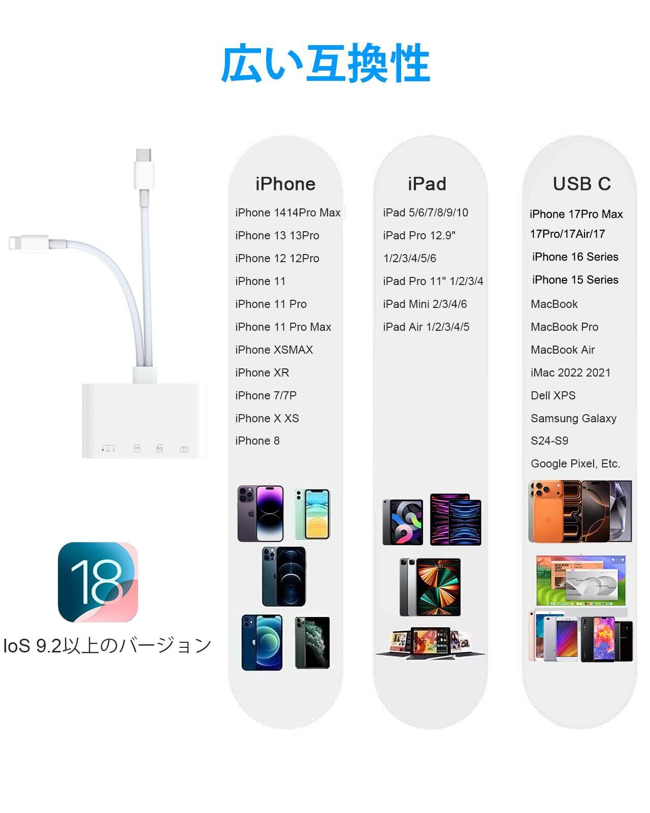 【多機能Type-Cポート】iPad sdカードリーダーのUSB C入力ポートには3つの機能(急速充電、データ転送、オーディオ転送)があり、様々なニーズに対応します。 例えば、充電しながらのデータ転送、音楽を聴きながらのデータ転送など。
