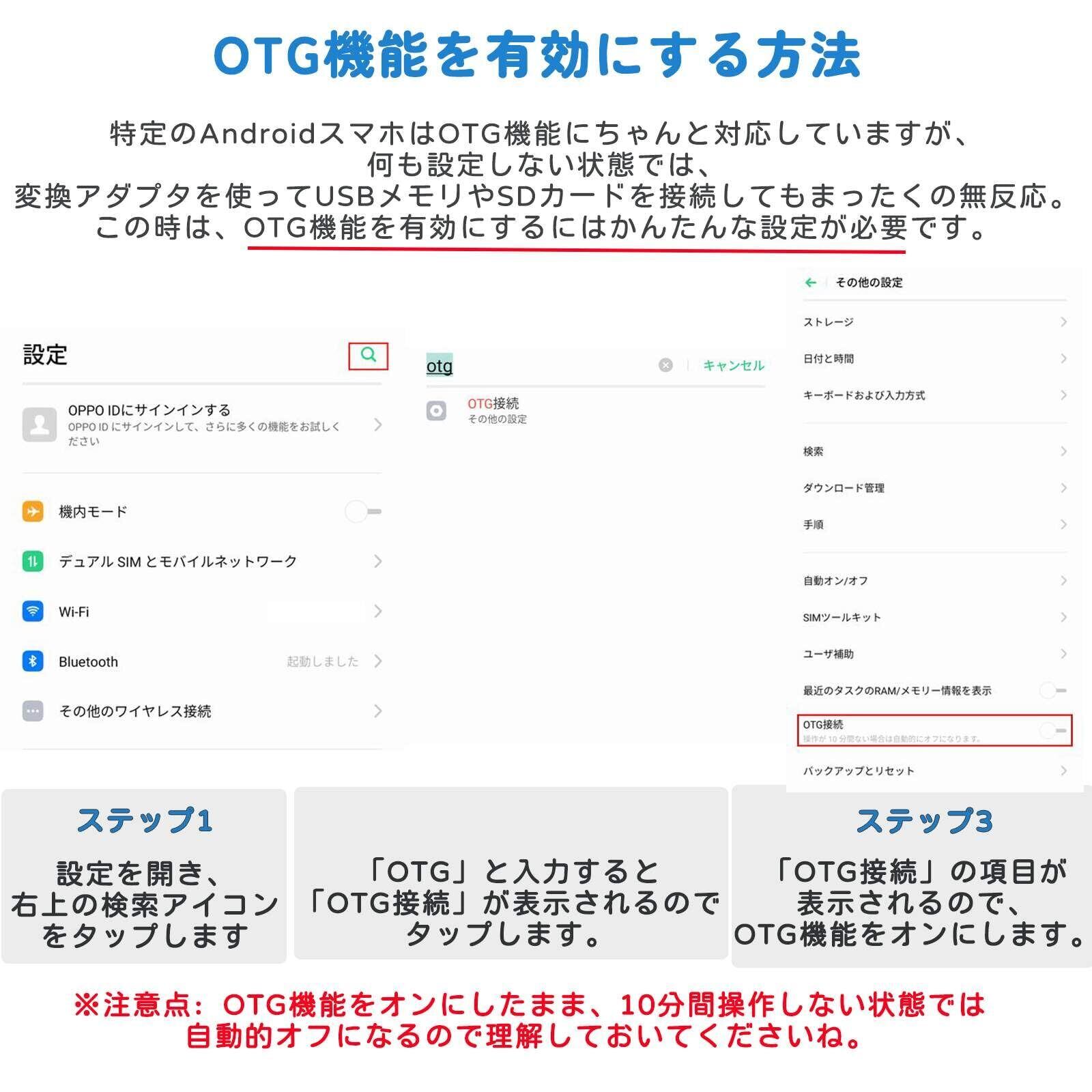 【OTG機能・プラグ&プレイ】スマホとUSB機器をダイレクトにつなぐ「USB OTG」機能が搭載で、PCなしでも、挿すだけでスマホやタブレットなどのUSB Cデバイスが直接にメモリカードにあるデータにアクセスすることができます。専用アプリやインターネット不要でデータ通信制限を気にすることなく、カードリーダーを接続するだけで、簡単にデジタルカメラで撮影した写真をTypeC スマホに転送できます。▲お使いのUSB CスマートフォンがOTG機能に対応しているか確認お願いします。