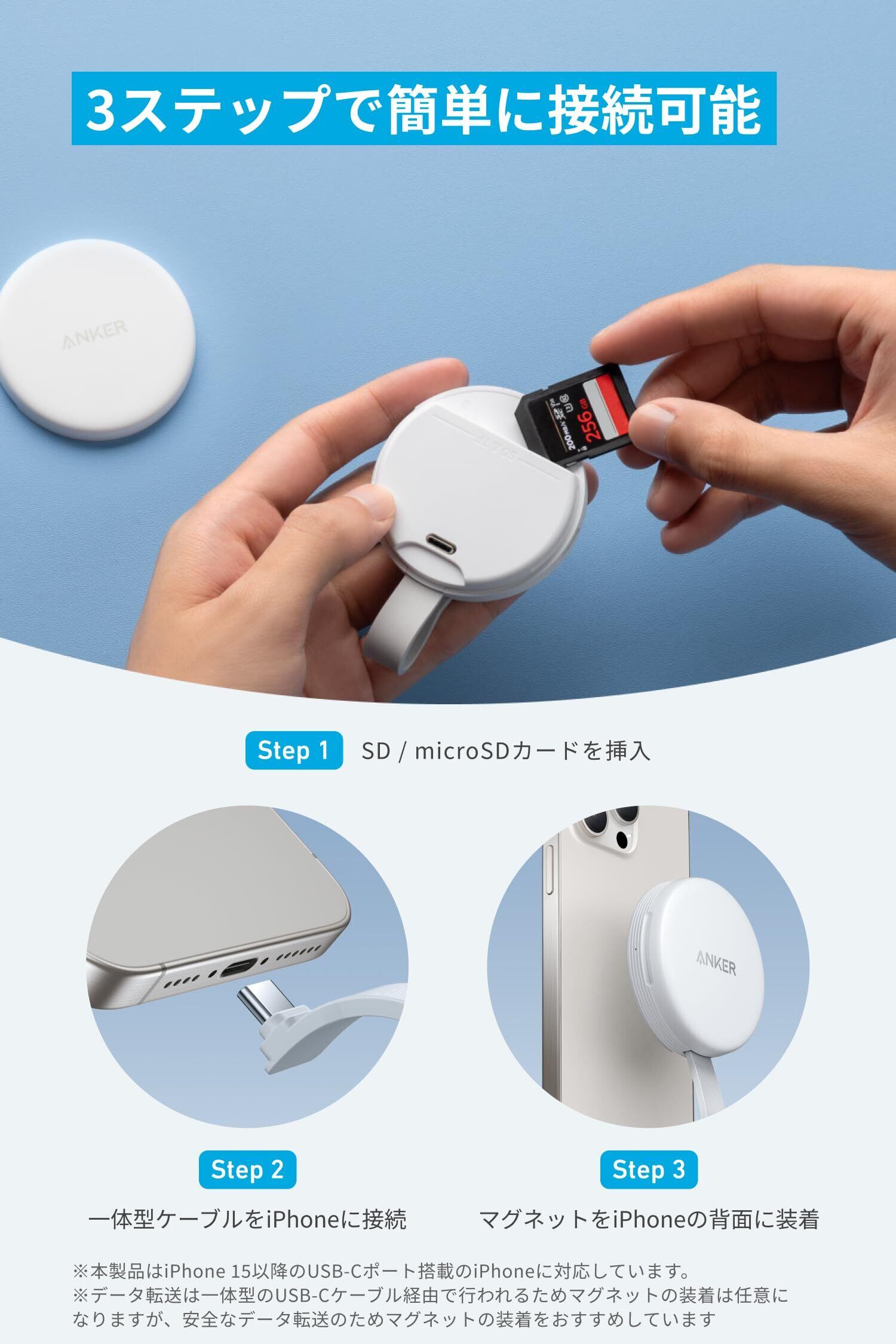 「『Anker MagGo USB-C カードリーダー』は、最新の3-in-1デザインで、SDカードスロット、microSDカードスロット、USB-Cポートを搭載しています。これにより、さまざまなデバイスとの接続が可能で、データの移行や保存が簡単に行えます。」