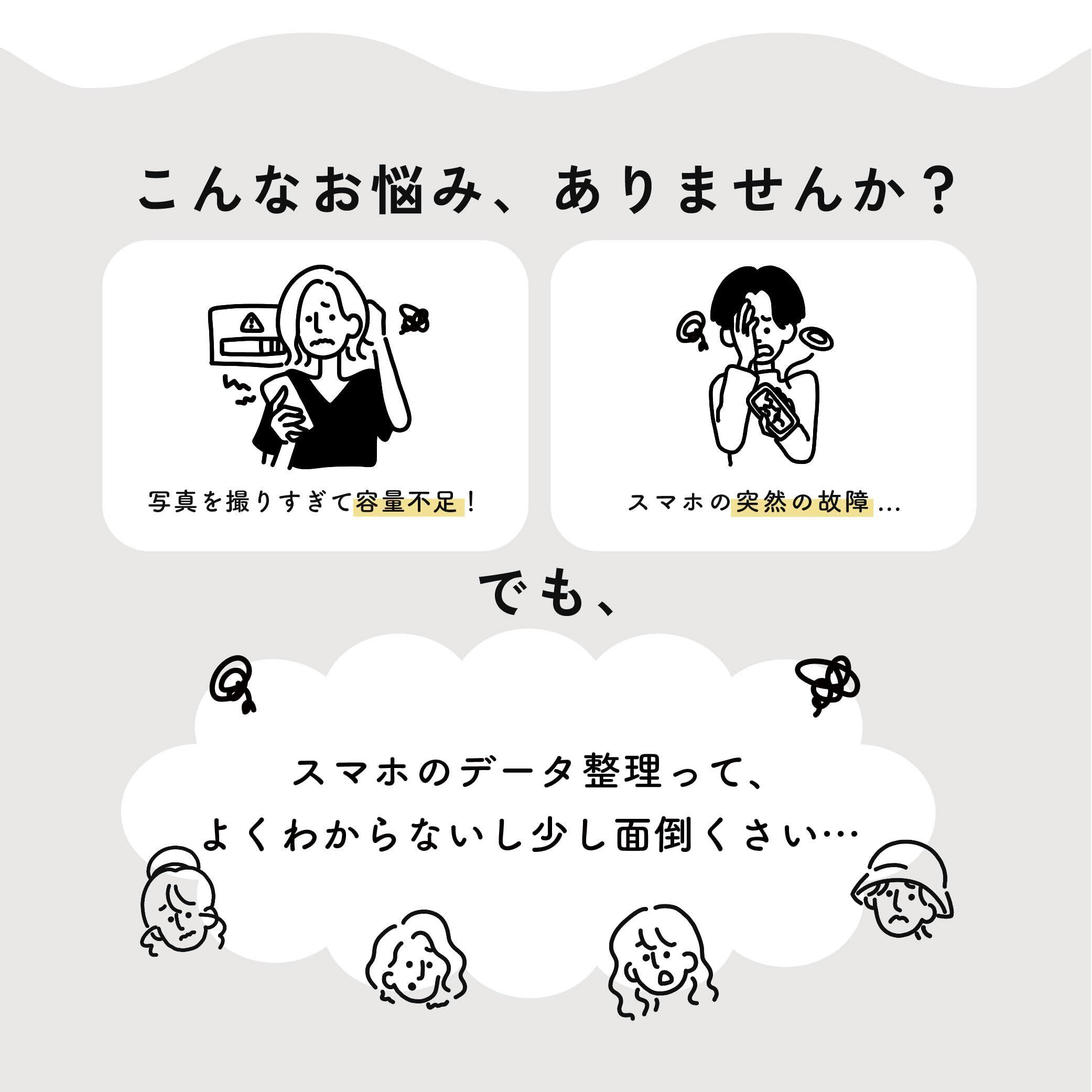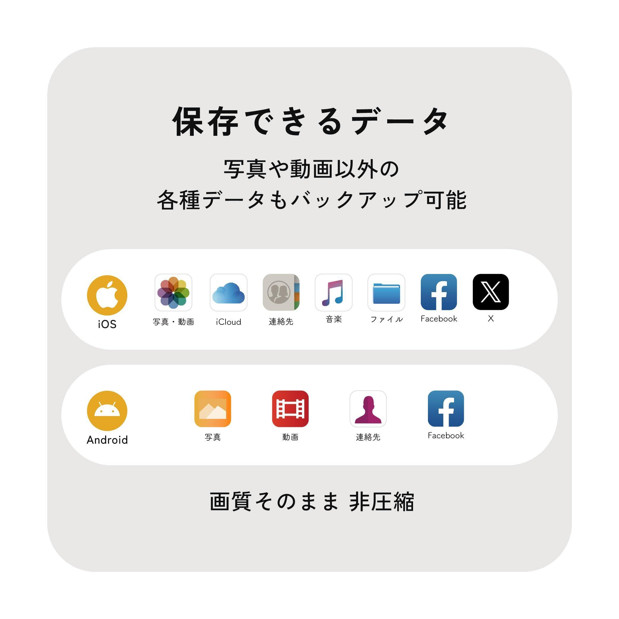 【保存できるもの】写真、動画、音楽、連絡先、SNS(Facebookの画像など)、ファイルアプリのデータ※OSごとに保存できる内容は異なります。