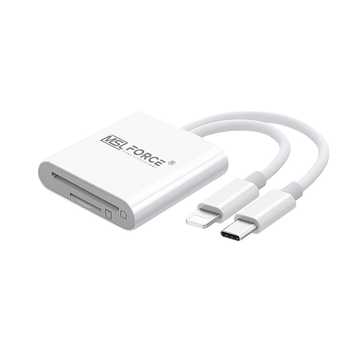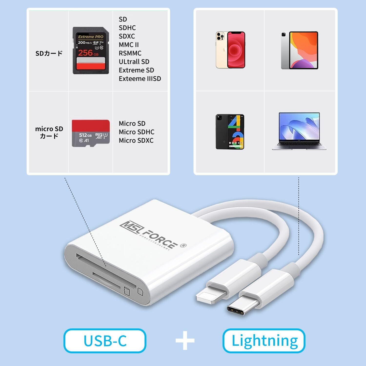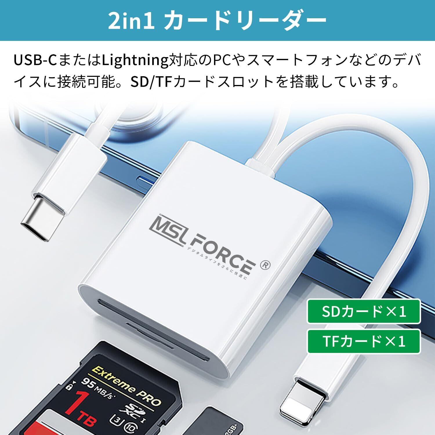 「『MSL FORCE 2in1 ライトニング microSDカードリーダー』は、LightningタイプとType-Cの両方に対応した便利なデータ転送リーダーです。iPhoneやAndroidデバイスで、SD/TFカードからのデータ読み込みや書き込みが簡単に行えます!」