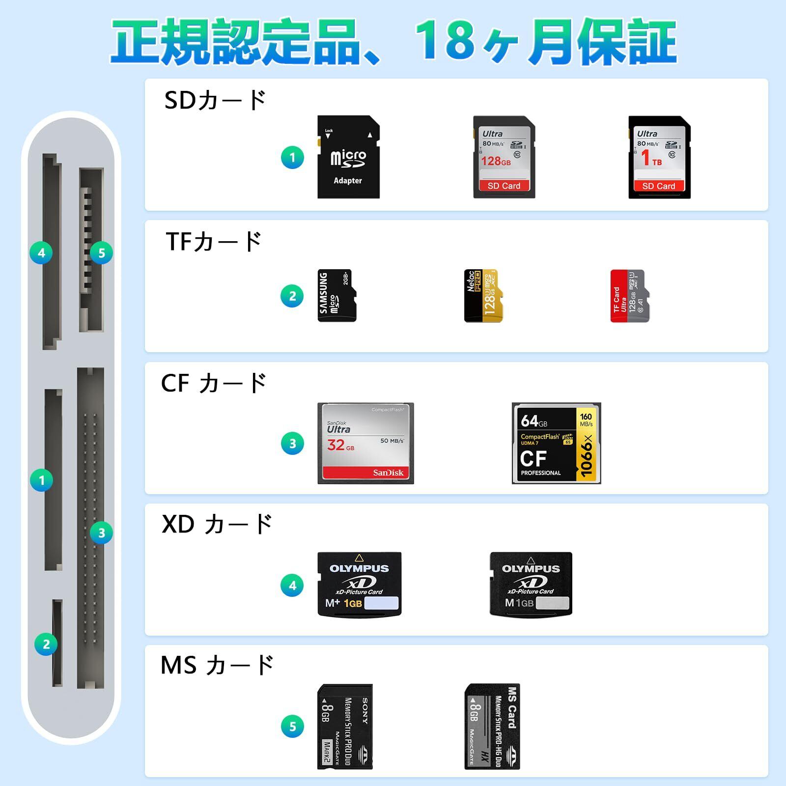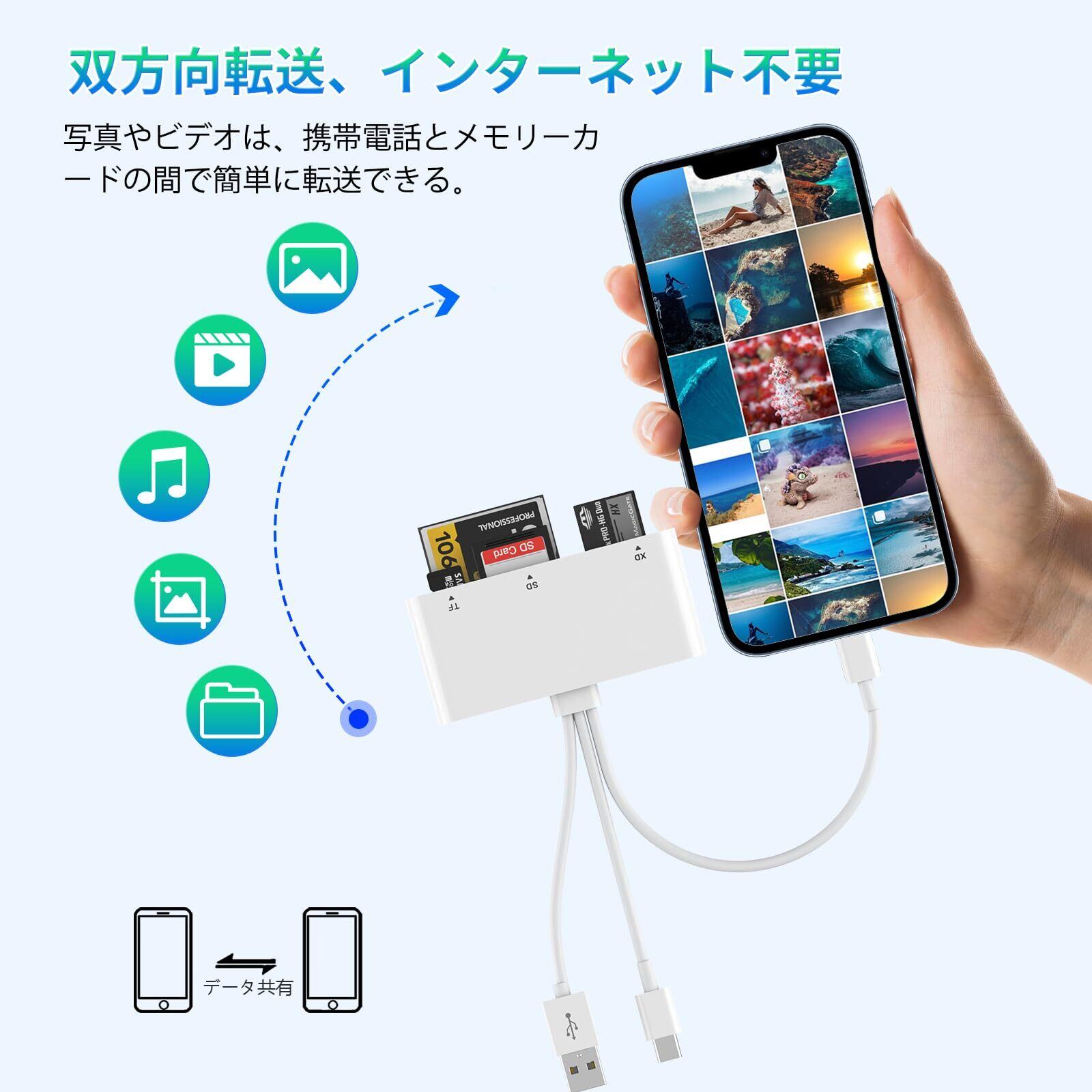 【5-in-1 スマホ カードリーダー】このSDカードリーダーは、SDカード(SD /SDHC/SDXC/MMC/RS-MMC)、TFカード(Micro SD/Micro SDHC/Micro SDXC)、XDカード、CFカード、MSカードの5種類のカードを素早く読み書きできる。 データ転送のニーズをすべて満たすことができ、メモリ容量を気にすることなく、いつでもどこでも写真やビデオを共有することができます。