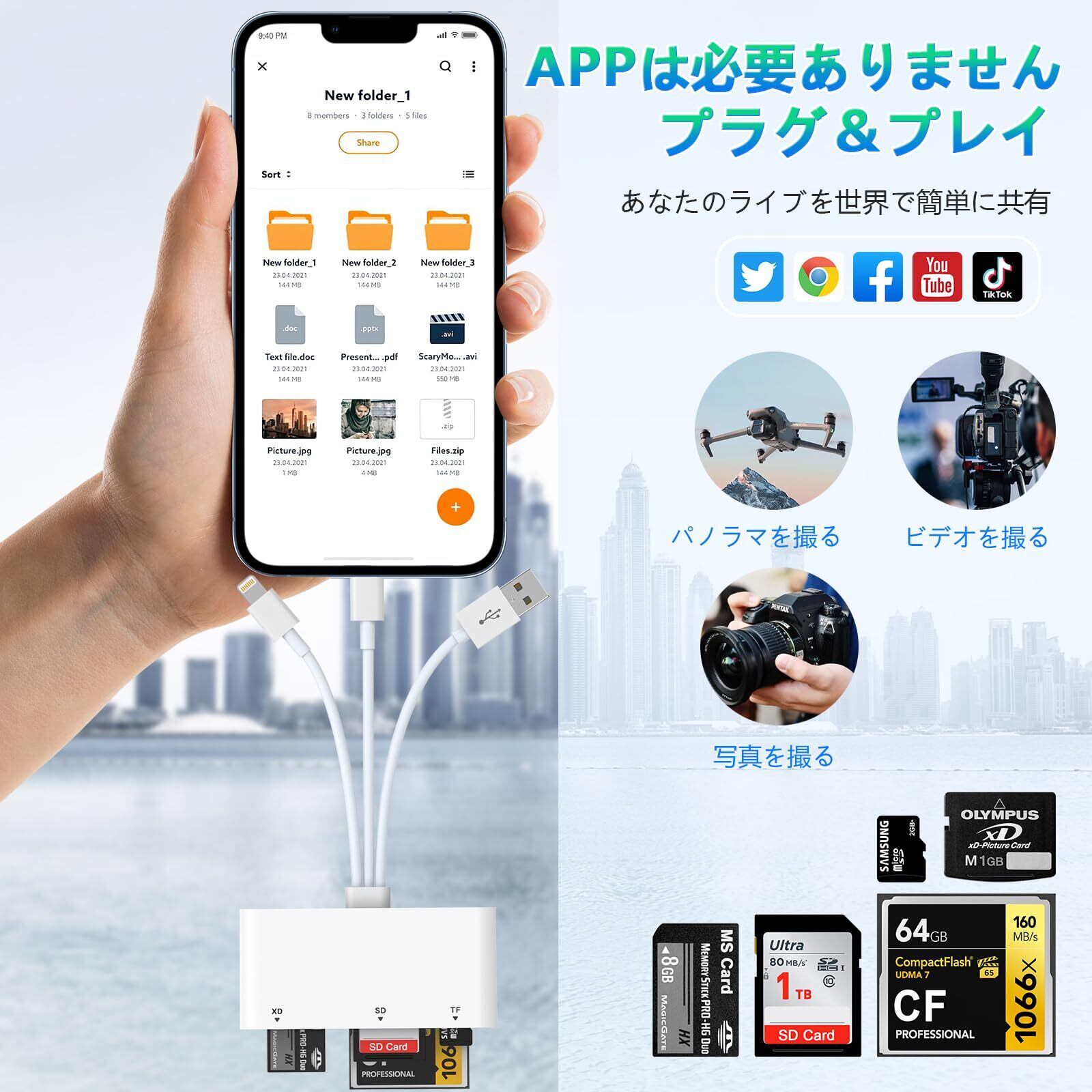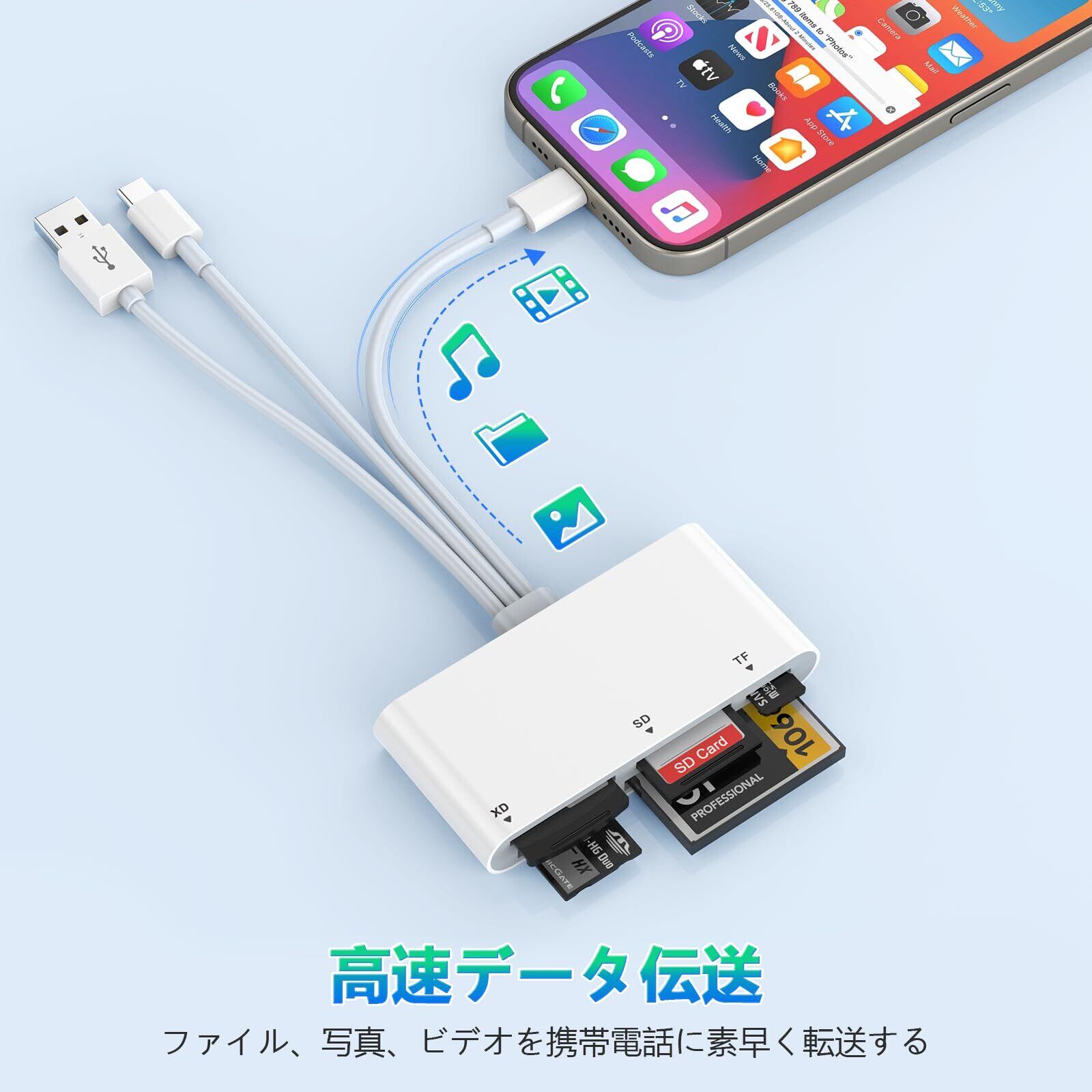 「iPhone 16/15/15 Plus/15 Proシリーズ、MacBook Pro/Air、iPad、Androidスマートフォンを含む、多様なデバイスに対応しています。このリーダーを使えば、さまざまなデバイスで簡単にデータの読み込み・書き込みが可能です。」