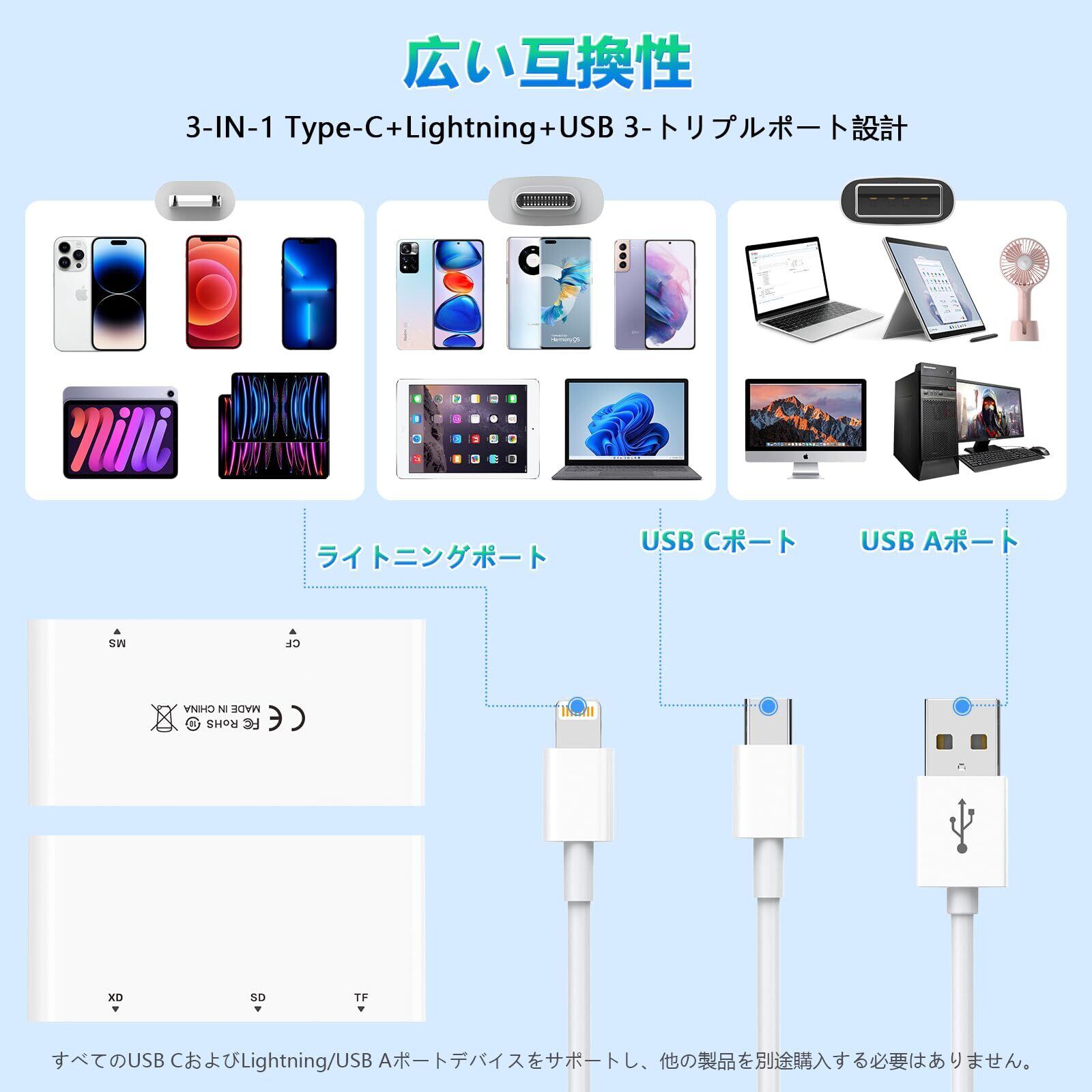【2025安定高速版】マルチカードリーダー, 5in3 Lightning/Type-C/USB - SD/TF(Micro SD)/XD/MS/CF カードリーダー メモリーカードリーダー OTG対応 高速転送 iPhone 16/15/15 Plus/15Pro/Pro Max, MacBook Pro/Air, iPad, iMac, Android スマホ, ピクセル, PCに対応