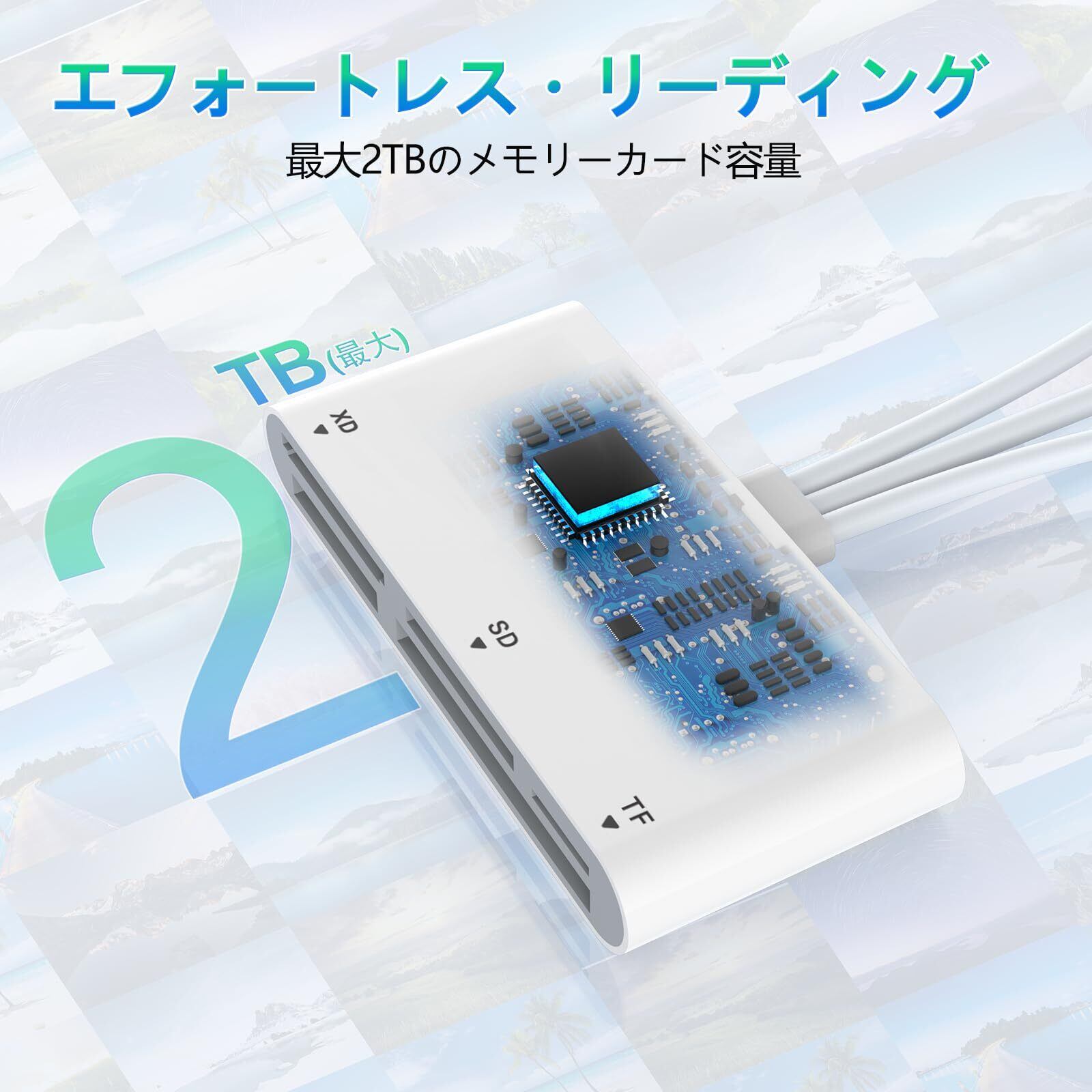「この製品は、最新のテクノロジーを活用した高速データ転送機能を搭載しており、写真や動画、音楽等の大容量データもストレスフリーで扱えます。最大2TBのカードに対応し、容量不足を解消できます。」