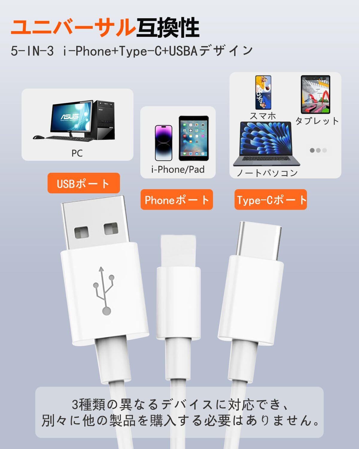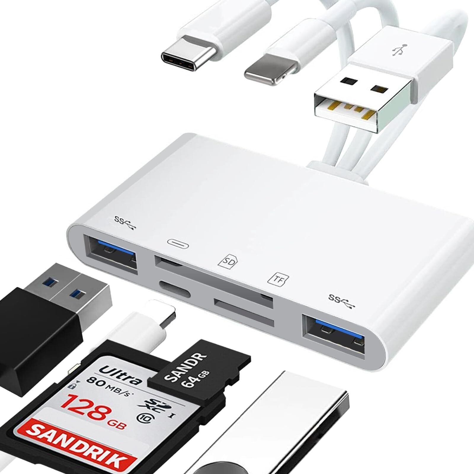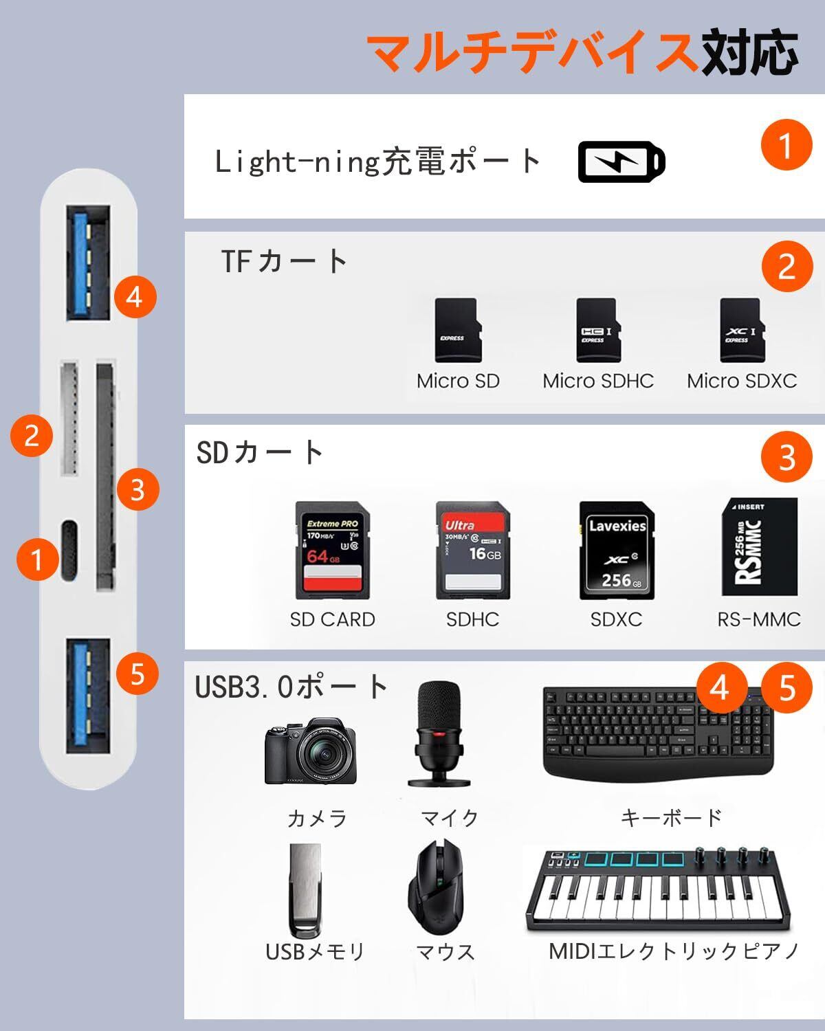【5in3・SDカードリーダー】カードリーダーの3本のケーブル(Ligtn-ing/Type-C/USBケーブル)は、あらゆる携帯電話/Pad/Android/PCデバイスで使用できる。SDカードポート(SD / SDHC / SDXC / RS-MMC / MMC- Microカード)+TFカードポート(Micro SD / Micro SDHC / Micro SDXCカード)+Phone充電ポーinト+USB 3.0ポート*2。