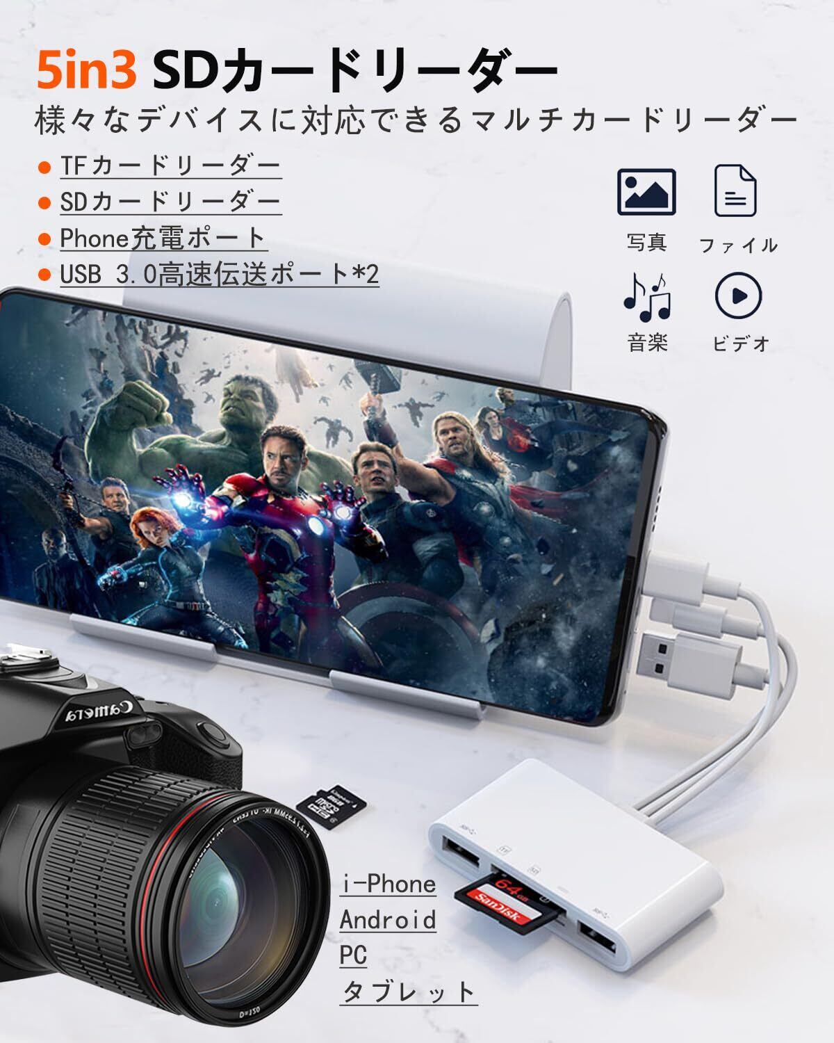 「『SDカードリーダー 5in3』は、Phone・Type-C・USBに対応した究極のカードリーダーです。SDカード(SD/SDHC/SDXC/MMC)やTFカード(Micro SD/Micro SDHC/Micro SDXC)からのデータの読み書きを簡単かつ迅速に行え、スマートフォンやパソコンへの写真、ビデオ、資料の転送を快適にサポートします!」