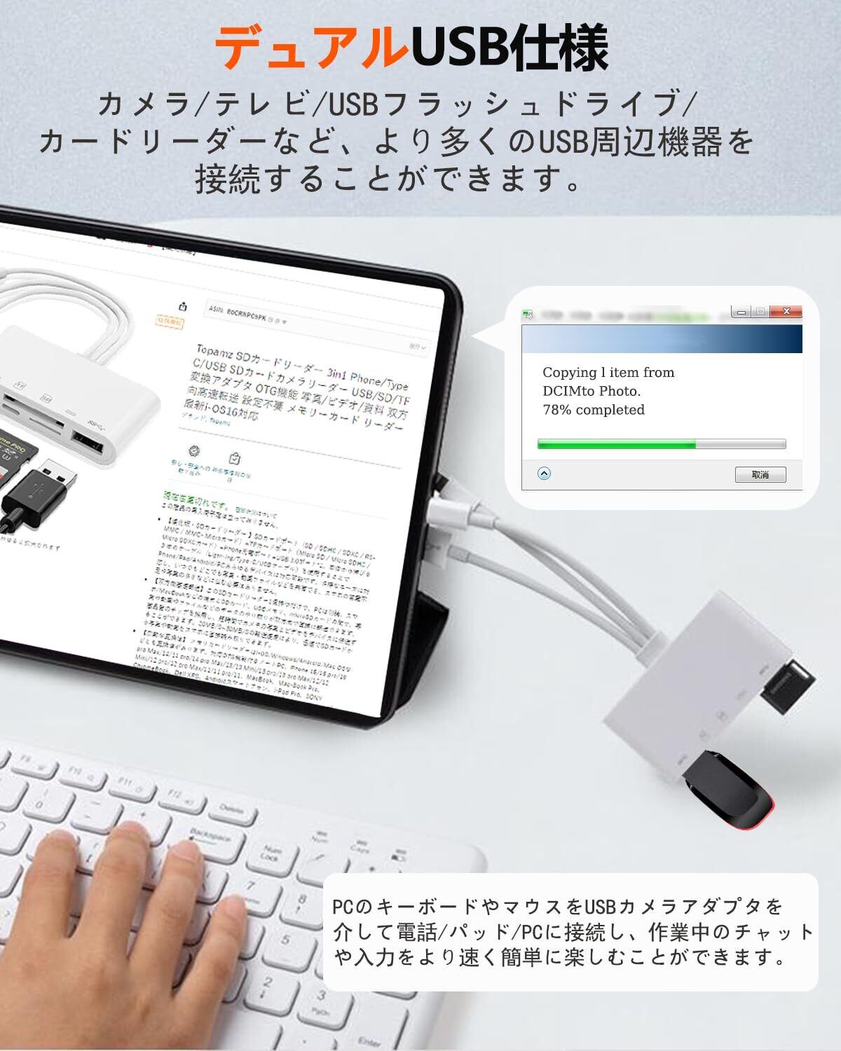 【高耐久・安心品質】Phone/Type C 5in3 SDカードリーダーとは,何万もの曲げと再挿入テストを採用し,引っ張りやねじれに対する高い耐久性を実現し,柔軟性はあるが断線しにくく,ケーブルを傷めない耐久性に優れています。もし何のご不明点とご問題がございましたら、お気軽ににメールでご連絡ください(で【注文履歴】→【出品者に連絡する】より弊店にご連絡お願いいたします)。24時間以内対応させていただきます。ご安心してご購入ください。