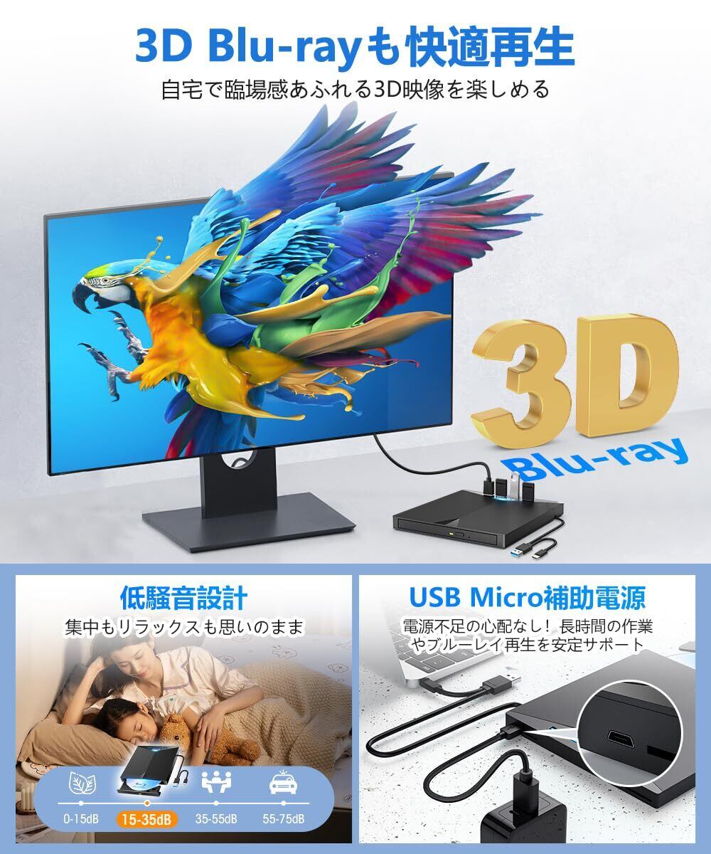 「この外付けブルーレイドライブは、USB3.0とType-Cの両方に対応し、高速データ転送が実現。Blu-rayやDVDの書き込みもスムーズで、特に大容量データの保存も迅速に行えます。忙しい方にもおすすめの高性能モデルです。」