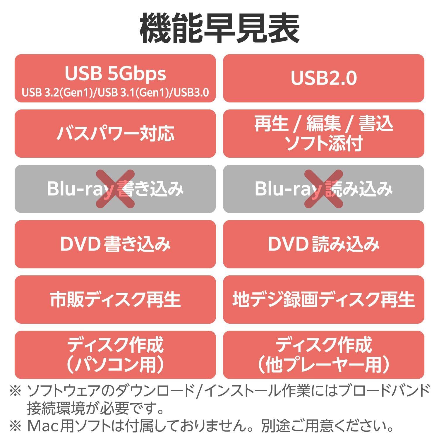■Macにも対応、接続するだけでDVDドライブとして利用可能です。DVD/CDメディアを利用したソフトウェアのインストール、Finderからのデータの書込み、Apple DVD Playerで市販DVDの再生が利用可能。※付属のソフトウェアはWindowsOS用で、macOSには対応しておりません。