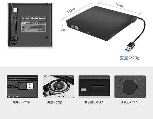 「この『外付けDVDドライブ』は、USB 3.0およびType-Cに対応した便利な外付けドライブです。映画鑑賞やデータインストール、音楽の再生まで幅広い用途に対応し、WindowsやMac OSに適応する高性能なアイテムです!受け取ったその日からすぐに使えるプラグアンドプレイ設計です。」