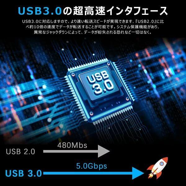 「USB 3.0およびType-Cを搭載し、最大5Gbpsの高速データ転送を実現!大容量の動画やファイルもスムーズに処理でき、効率的に作業が進められます。接続するだけで即座に使えるので、手間いらずです。」