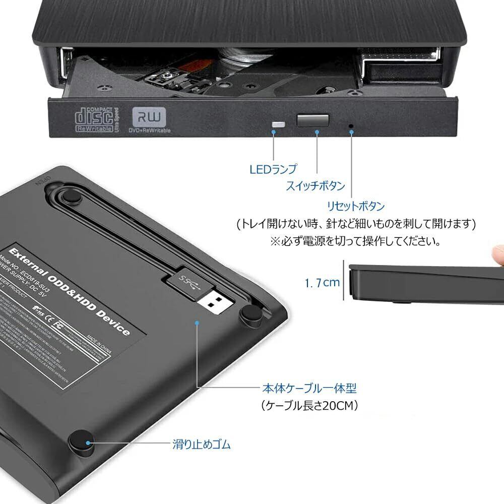 【USB3.0高速転送】この外付けDVDドライブはUSB2.0と比べって、データの転送スピートは約10倍以上の最大5Gbps(640MB/s)の超高速 USB3.0を搭載するため、データ転送と読み込みスピードが更に速くなります。ドライブの底面にケーブルを収納できて、ケーブルを紛失する心配はなく、底は4つの滑り止めのゴムがあり、安定性が高いです。