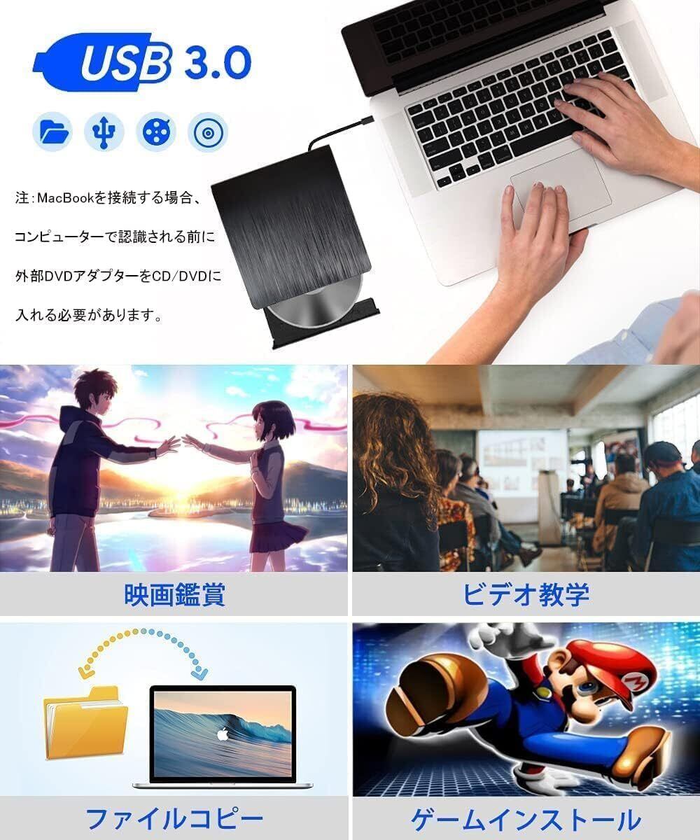 「この『Parishop 外付け DVD ドライブ』は、USB3.0ポートで接続可能なポータブルドライブです。静音性に優れ、WindowsおよびMac OSの両システムに対応しているため、さまざまなデバイスで使いやすく、大切なデータの保存や映画鑑賞に最適です。超スリムデザインで携帯性も抜群です!」