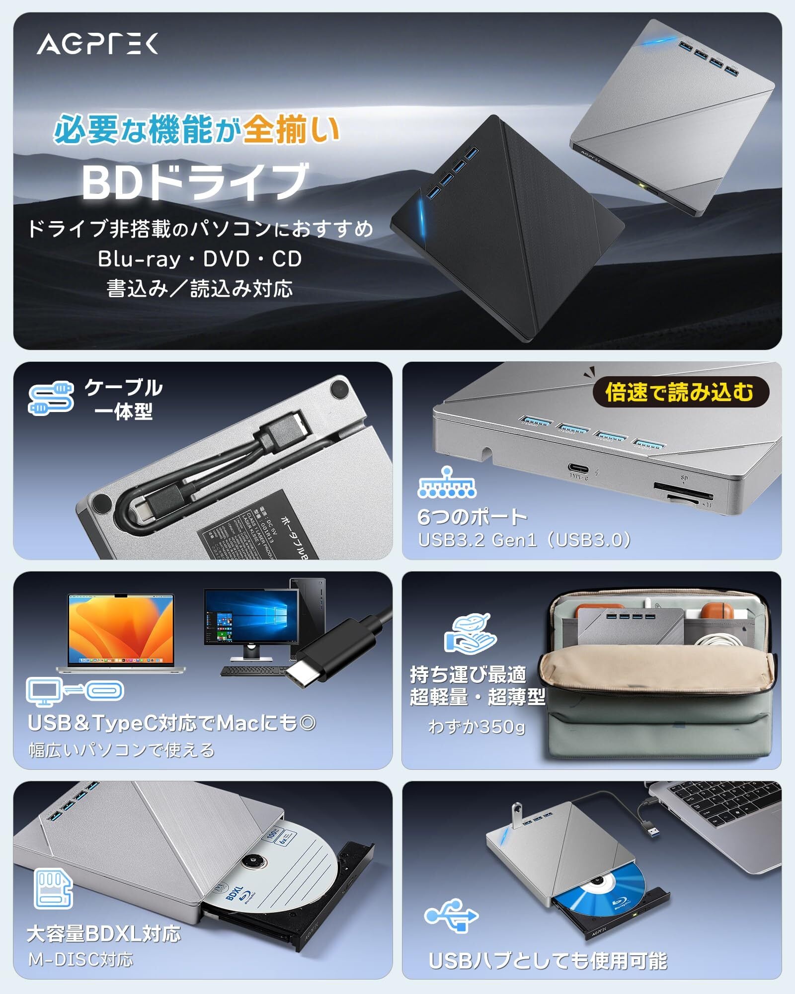 「この『ブルーレイドライブ 外付け』は、最新技術を駆使した外付けドライブで、USB3.0とType-Cの両接続に対応。ブルーレイ、CD、DVDのデータ読み込みや書き込みが簡単に行える便利なアイテムです!」