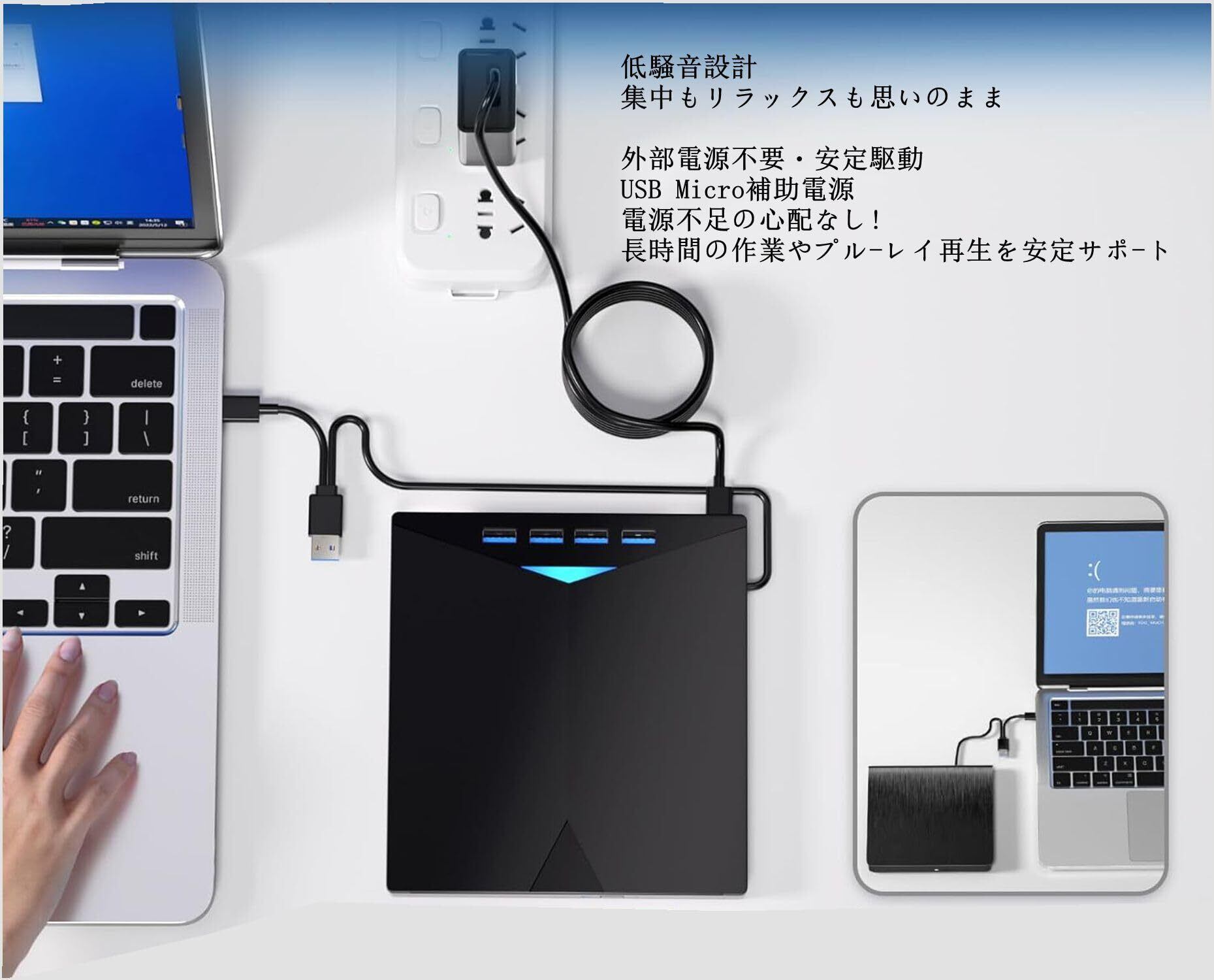 【バスパワー駆動】 この 外付けブルーレイドライブ は、USBバスパワーで駆動するため、外部電源不要で手軽に使用できます。この ブルーレイドライブ 外付け なら、 長時間の使用やブルーレイ再生時も安心してお使いいただけます。ご注意:十分電力供給を確保するために、USBハブ と USB コネクタをご利用しないでください。