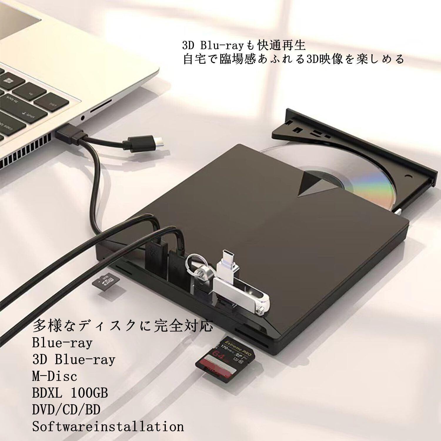 「このドライブは、Blu-rayや3D Blu-rayはもちろん、BDXL・M-DISCにも対応しています。重要なデータのバックアップや映画の再生など、さまざまなシーンで大活躍。業務用から家庭用まで幅広く利用できます。」