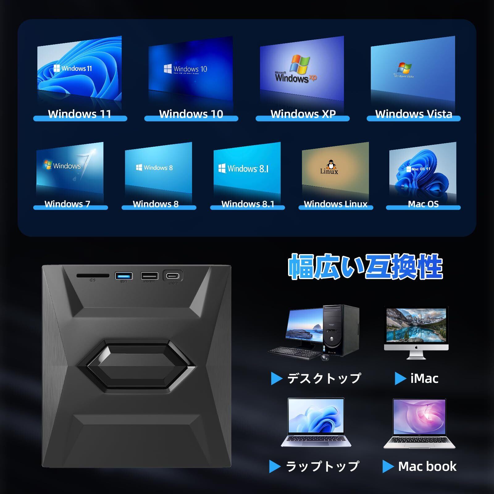 「Windows 7/8/10/11、XP、Macに対応し、さまざまなデバイスで使用可能です。多様な環境でも問題なく利用でき、簡単にメディアライフを楽しめます。」