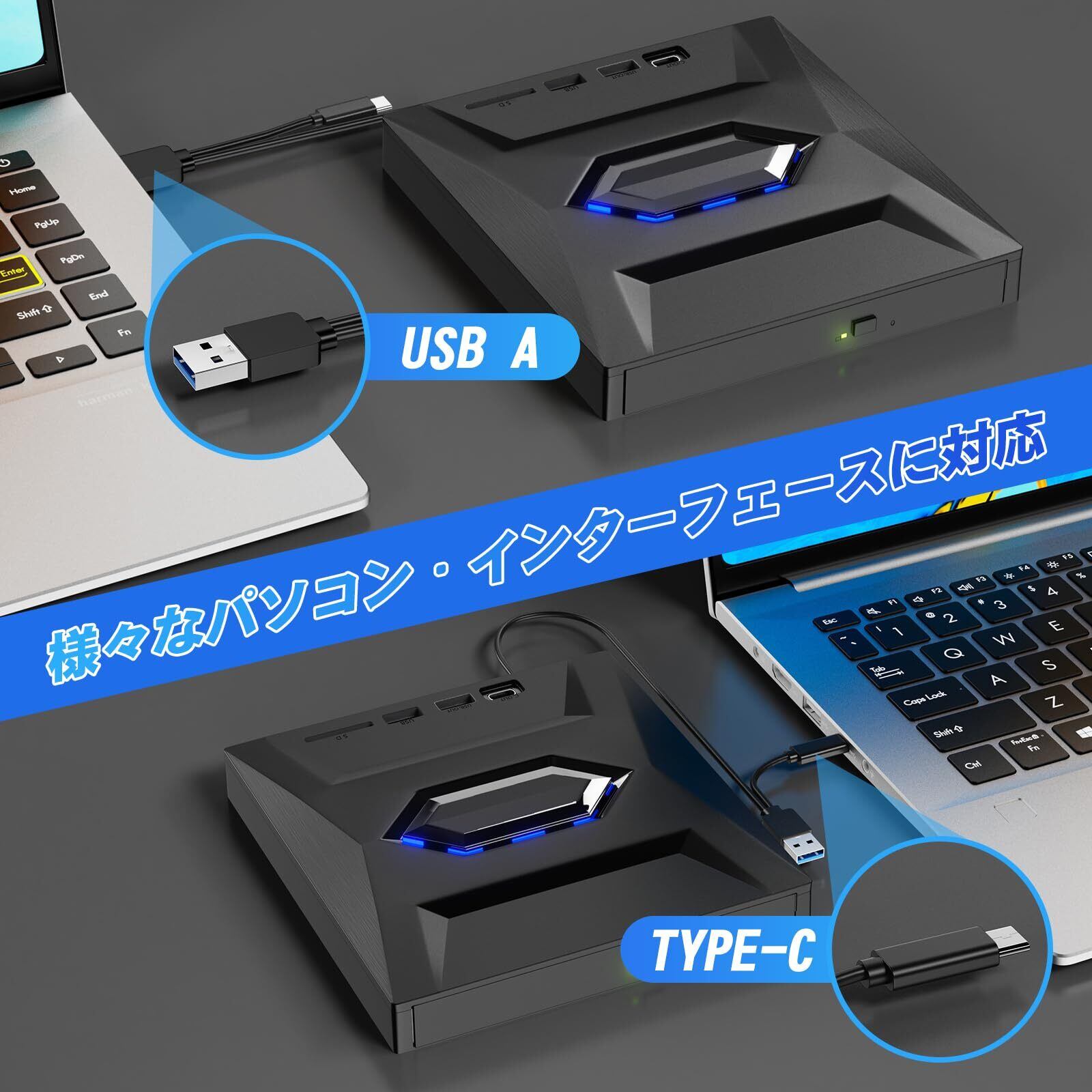 「特別なドライバーのインストール不要で、接続するだけで簡単に使用開始できます。USB3.0接続により、高速なデータ転送を実現し、BD、CD、DVDの読み取りや書き込みもスムーズに行えます。」