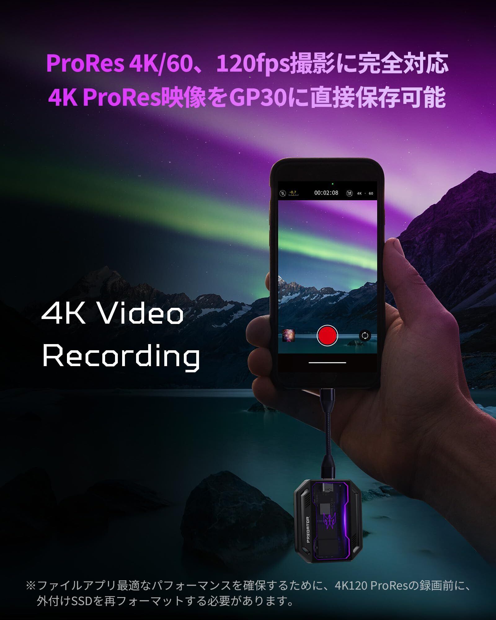 【4K ProRes外部録画】iPhone 15/16以降のProシリーズにおけるProRes 4K 60/120fps外部録画に対応。高ビットレートの映像データも途切れなく保存でき、クリエイターに最適な外部ストレージ環境を提供します。