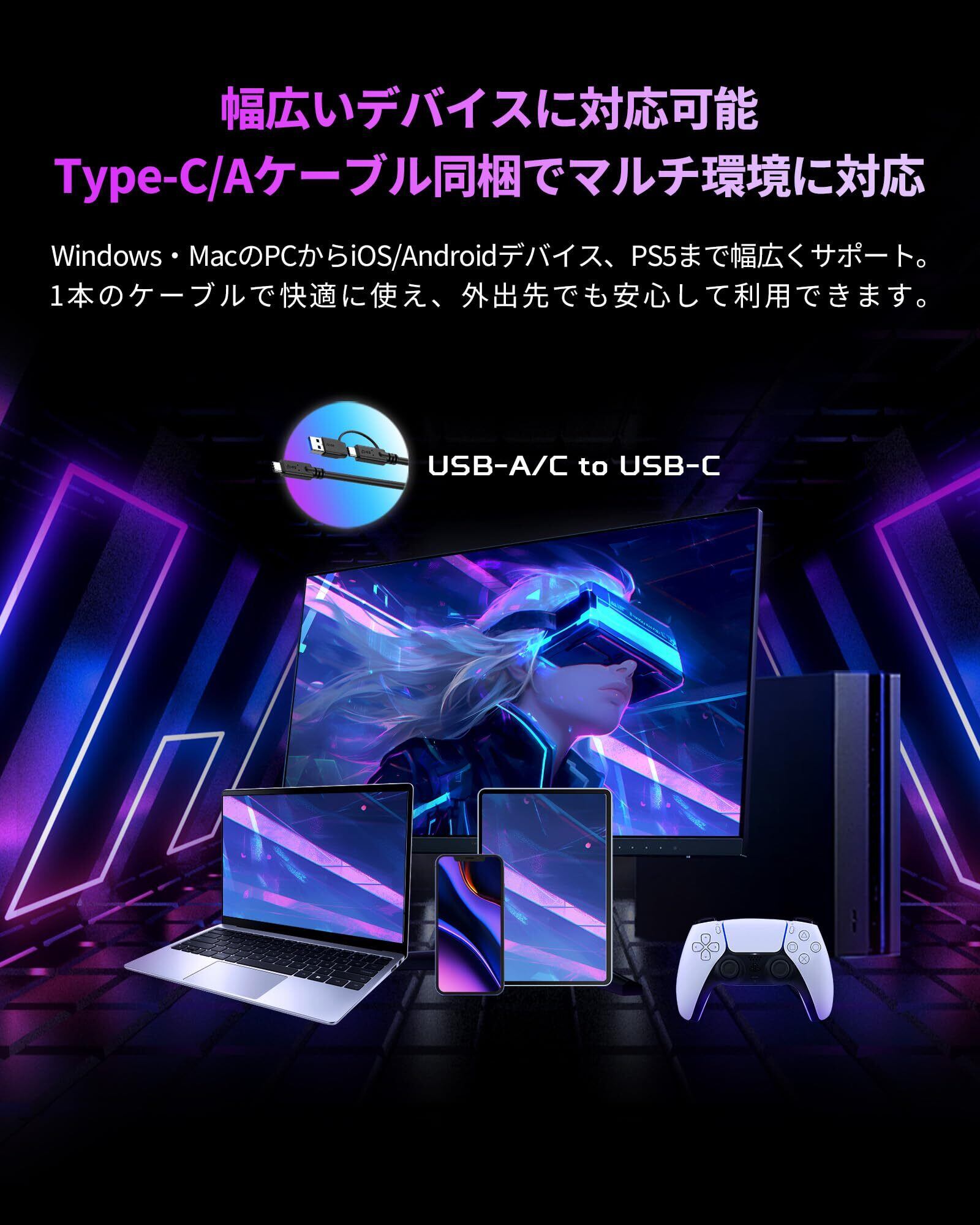 【Win/Mac・iOS/Android・PS5対応】付属品のType-A/Cの2in1ケーブルを用いて、動作環境がWindows/Mac OSパソコン、iOS/Androidデバイスだけでなく、PS5&PS5 Proなどの家庭用ゲーム機にも対応可能。