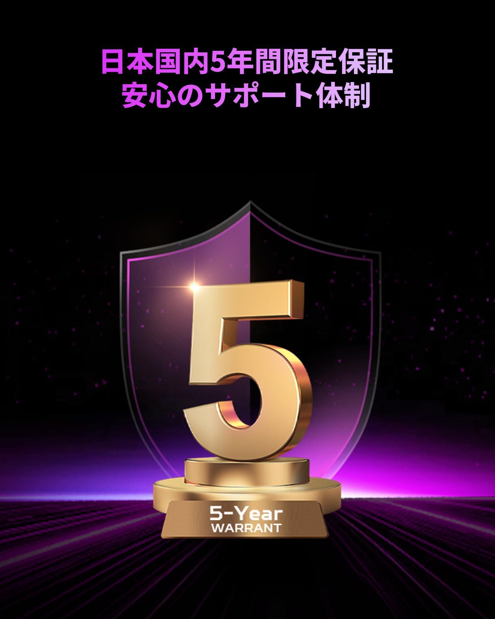 「購入日より5年間のメーカー保証がついており、万が一のトラブル時も安心です。また、日本語サポートもご用意しており、どなたでも安心してご利用いただけます。」